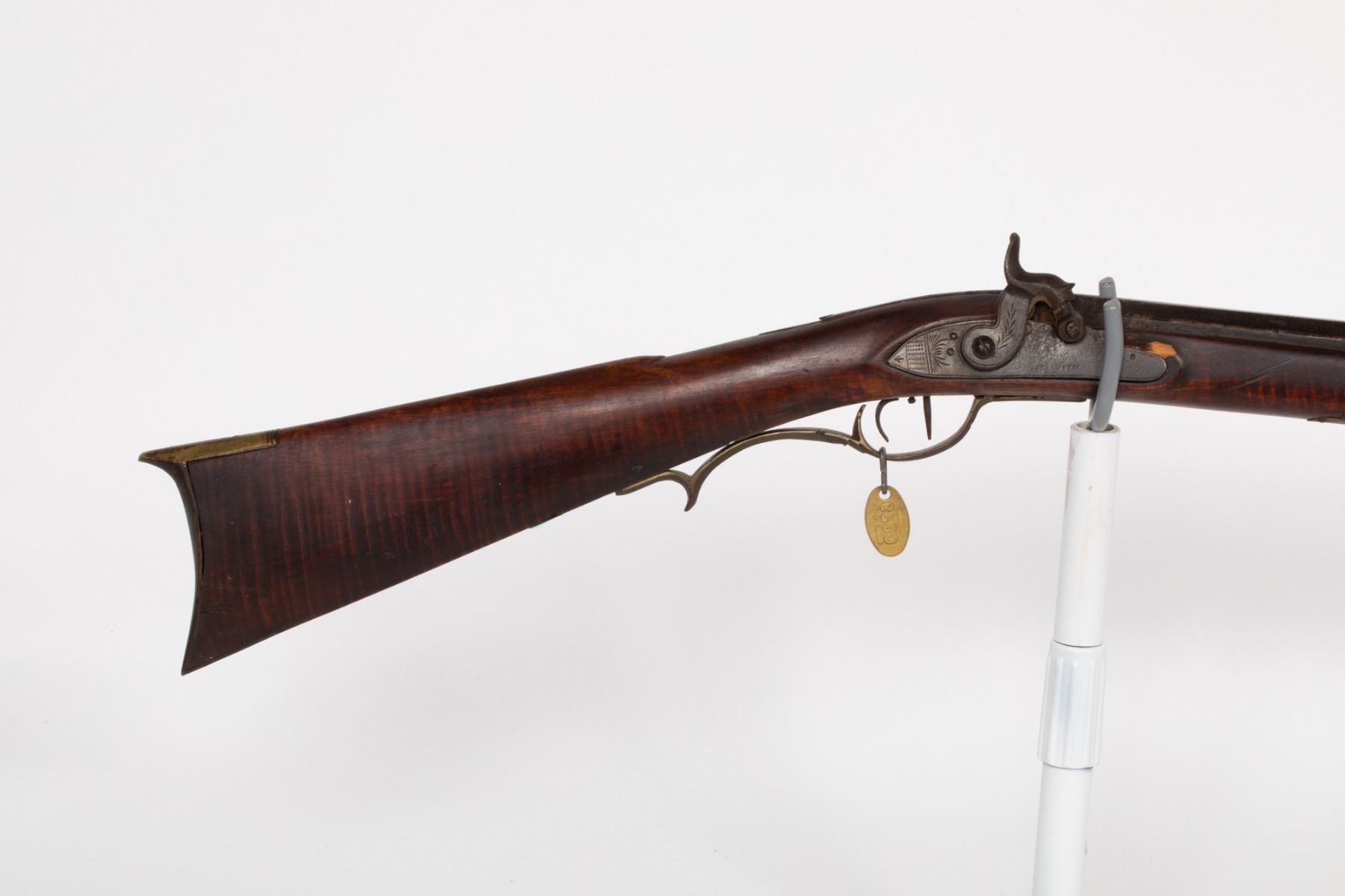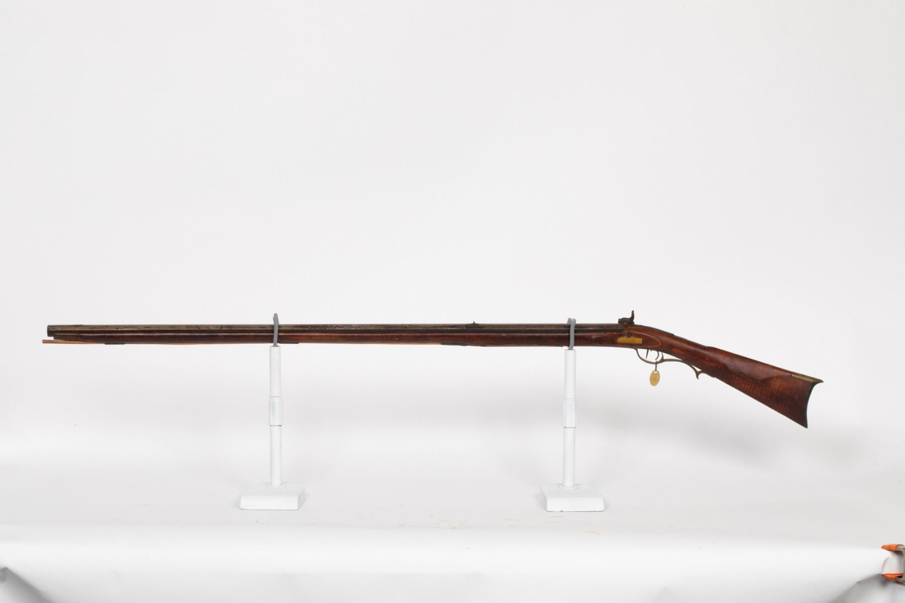 This is a percussion full-stock Kentucky rifle possibly of Pennsylvania origin. Caliber is about .42. Maker is unknown. SN: N/A, JMD Oval Tag: 6730, Condition: Fair, >