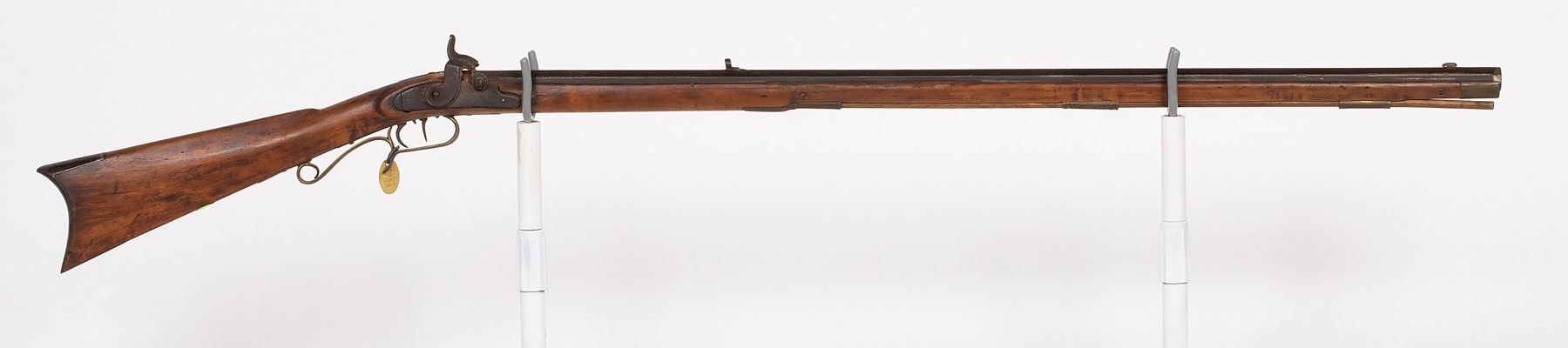 A full-stock Kentucky rifle with no ornamentation and with a Goulcher lock. SN: N/A, JMD Oval Tag: 6726, Condition: Good, >