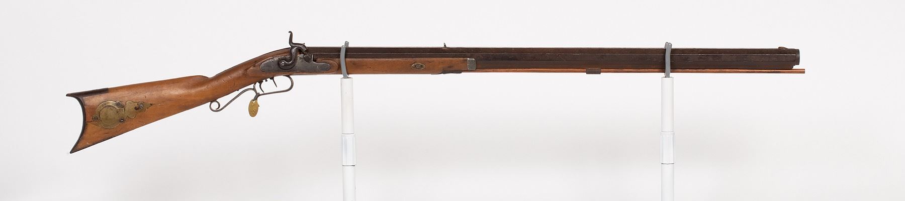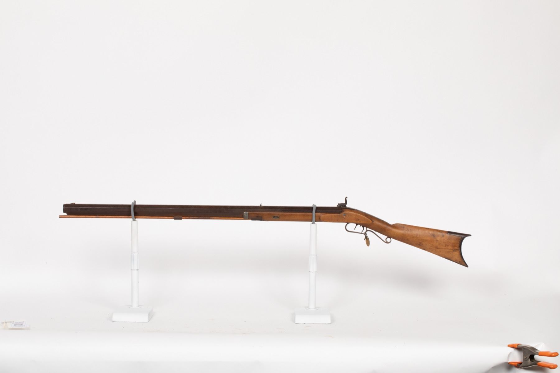 This is a light stocked half-stock Kentucky rifle n about .50 cal. In a light hard wood. In overall good condition with a capbox and percussion ignition. This is thought o be an Ohio or North Carolina gun with a long tang and two screw mounting. SN: N/A, JMD Oval Tag: 2130, Condition: Good, >