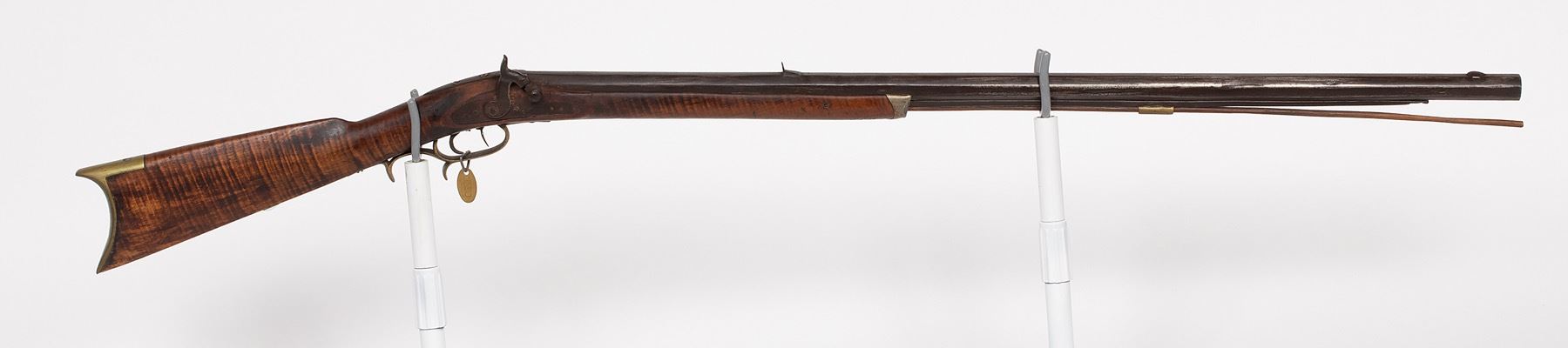 This is a half-stock Kentucky rifle about .48 cal. that is octagon to round without a wedding band. Beautiful tiger stripe maple wood. SN: N/A, JMD Oval Tag: 6798, Condition: Fair, >