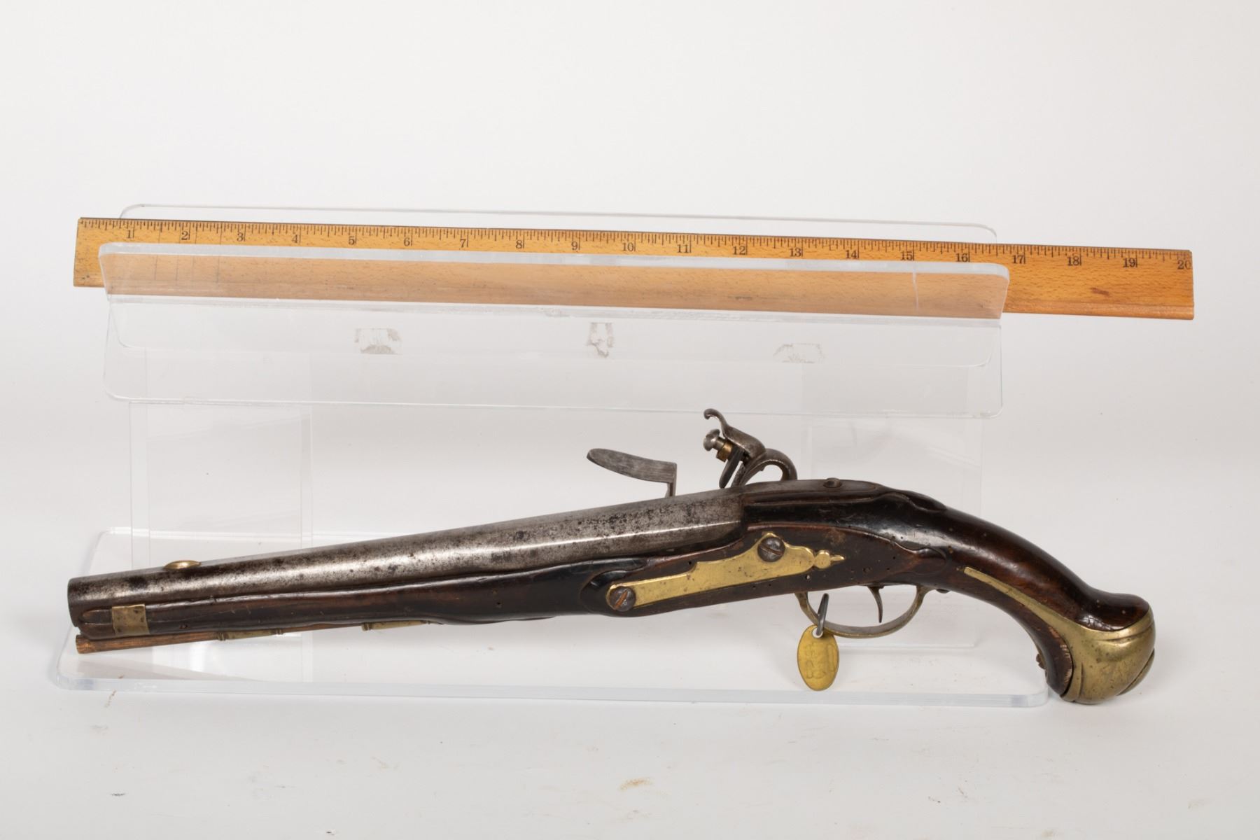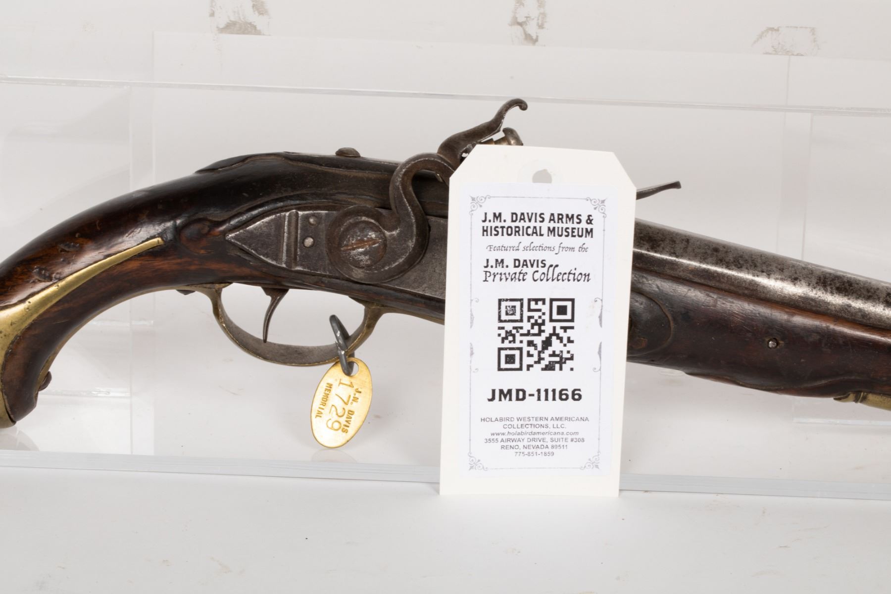 This is a flintlock pistol of the revolutionary period. (1770-1790's). A true Kentucky pistol because it does not fit any contract pistol dimensions; it is too long. U.S. Government contract pistols were of 14 in. or less in length. This one measures in at 20 in. (Reilly) p. 158). This pistol would have accompanied the frontiersman. SN: N/A, JMD Oval Tag: 1729, Condition: Very Good, >