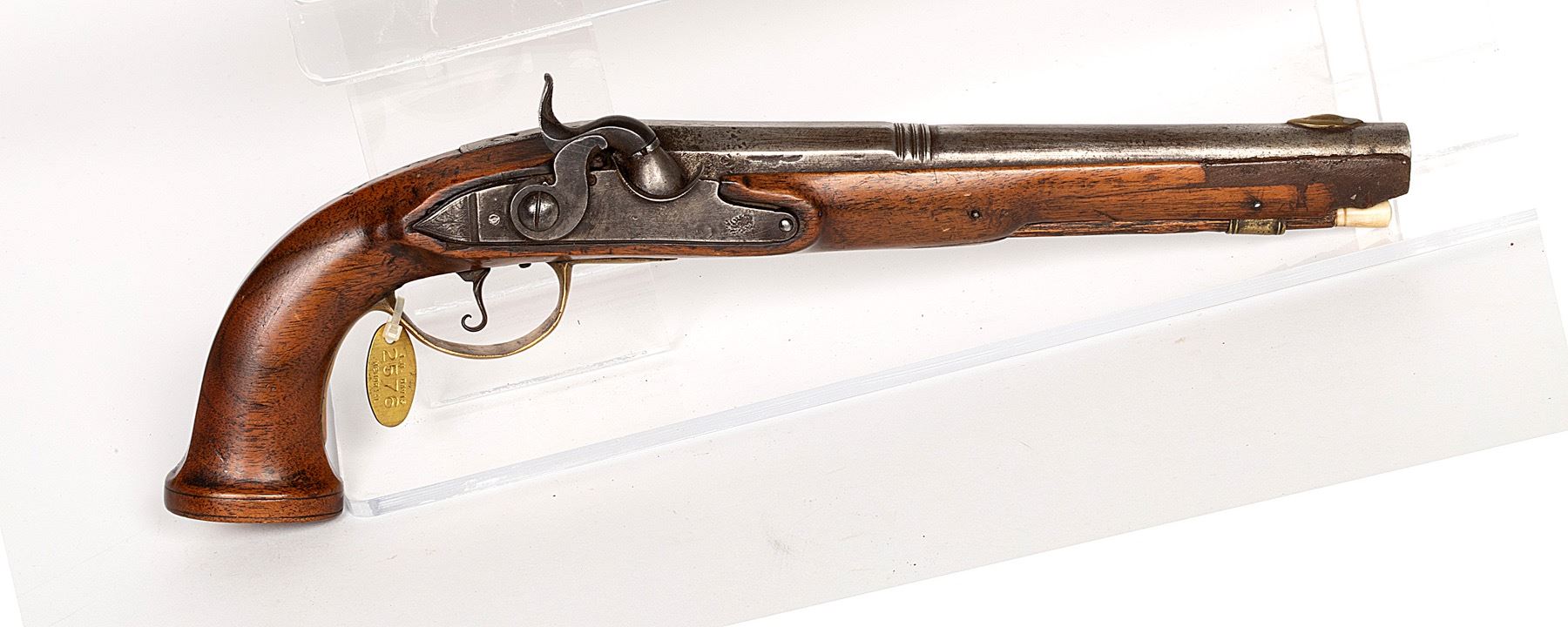 Pistol, Unknown manufacturer, Percussion Pistol, ramrod, brass side plate, engraving, SN: N/A, JMD Oval Tag: 2576, Condition: Good, >