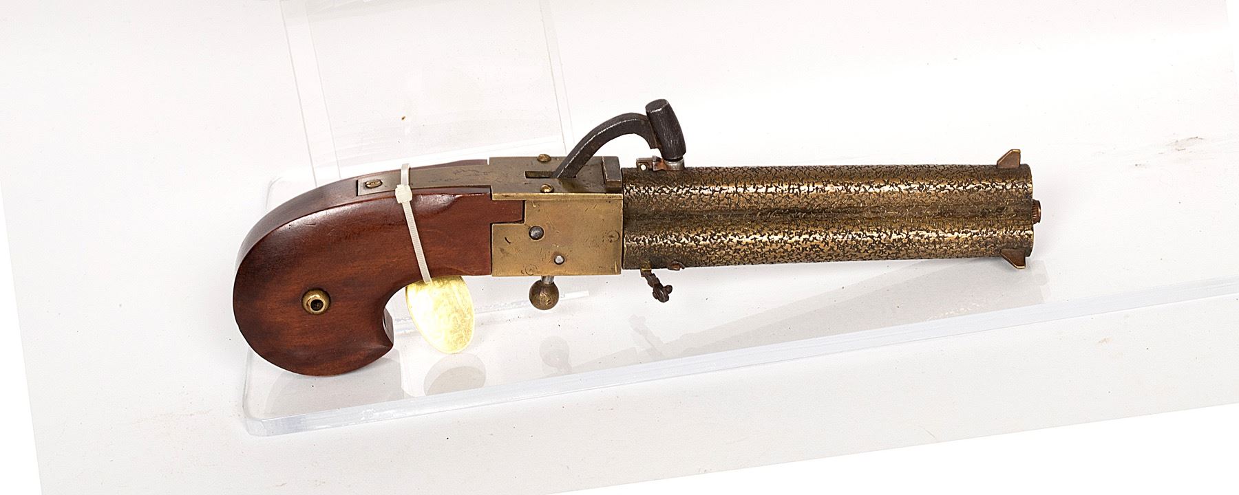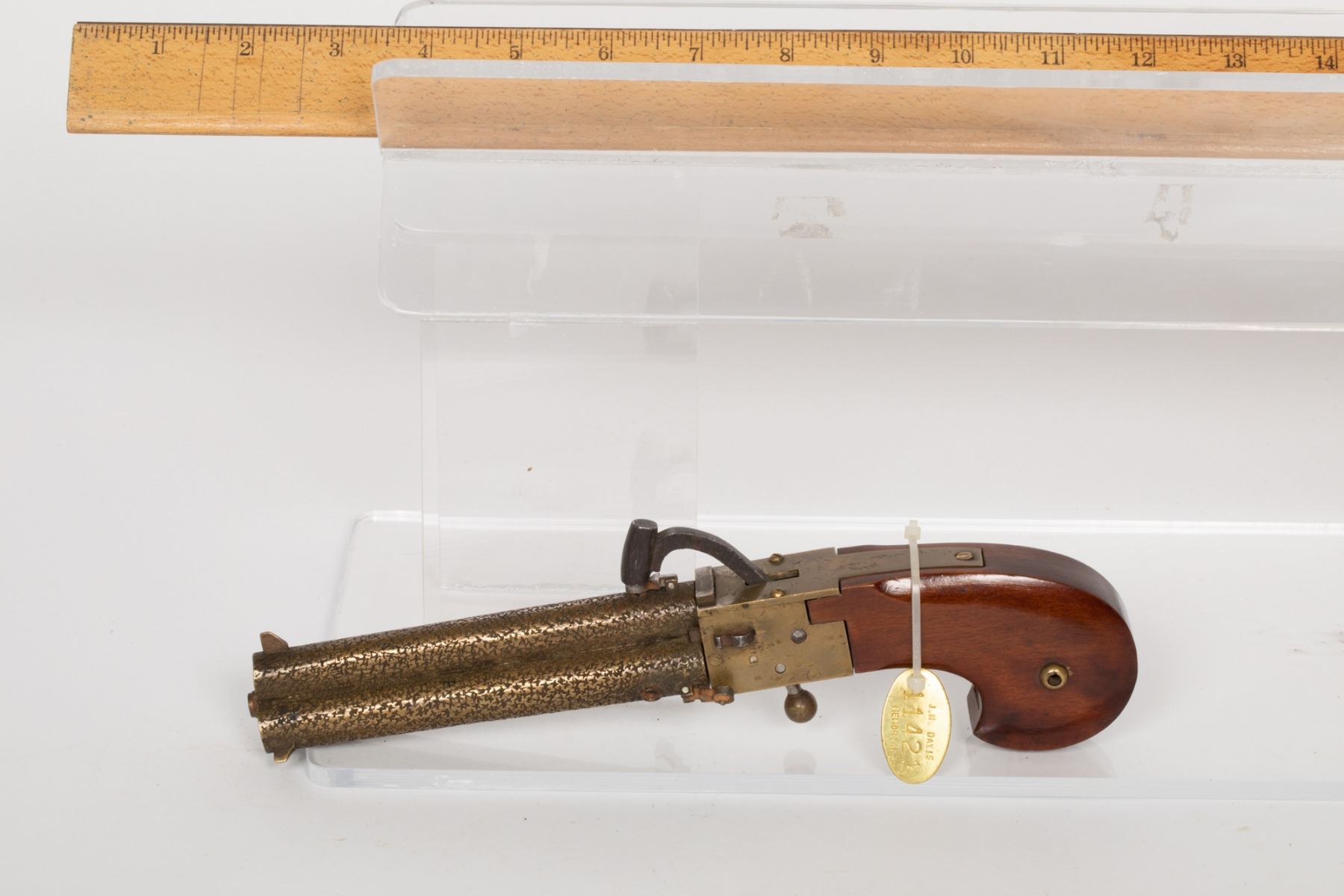 Pistol made from a rifle (registered), Unknown manufacturer.22 Pepperbox black-powder SN: N/A, JMD Oval Tag: 1142, Condition: Good, >