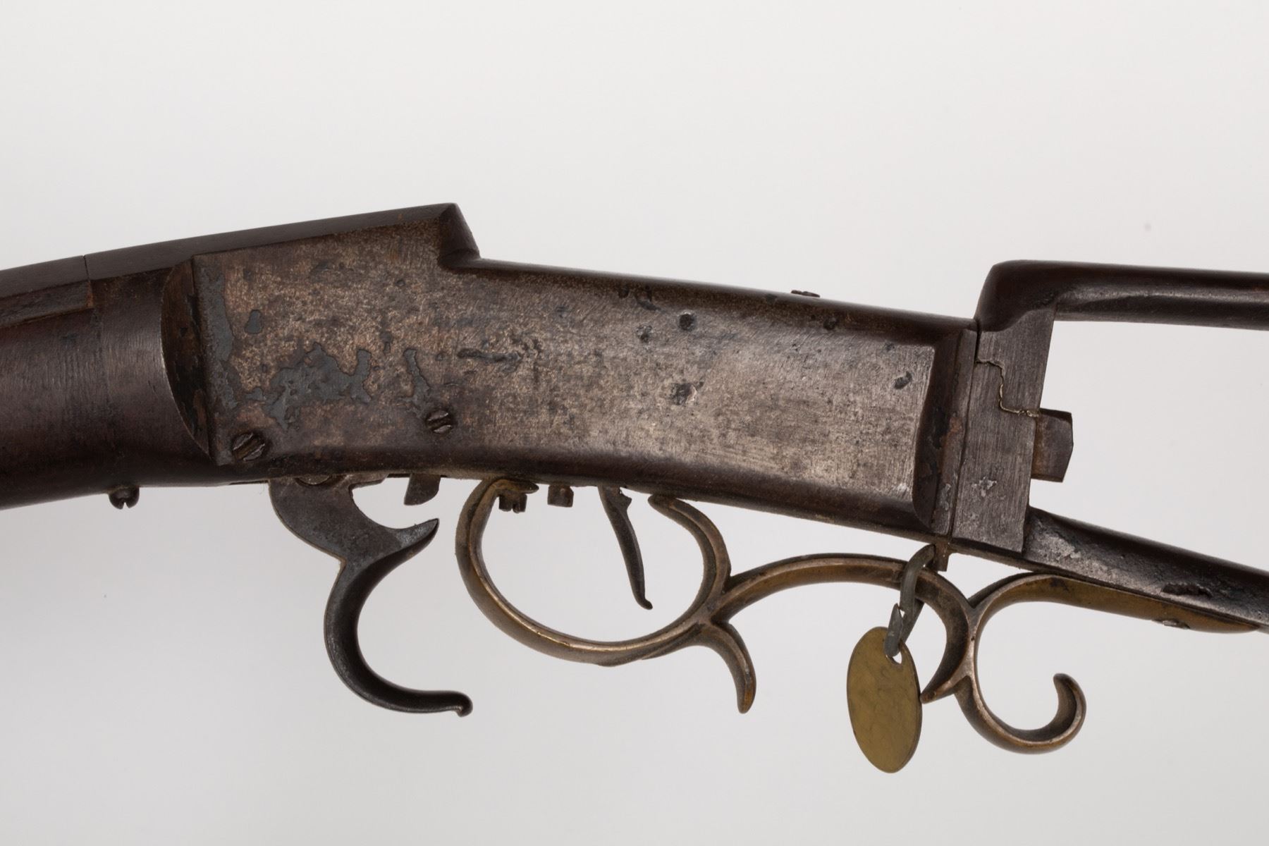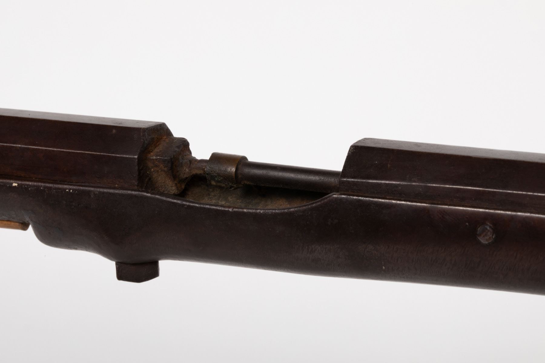 Rifle, Unknown manufacturer, possible composite gun converted musket into parlor gun, octagon barrel, blade front/notch fixed rear sight, no wood stock. SN: N/A, JMD Oval Tag: 1426, Condition: Fair, >