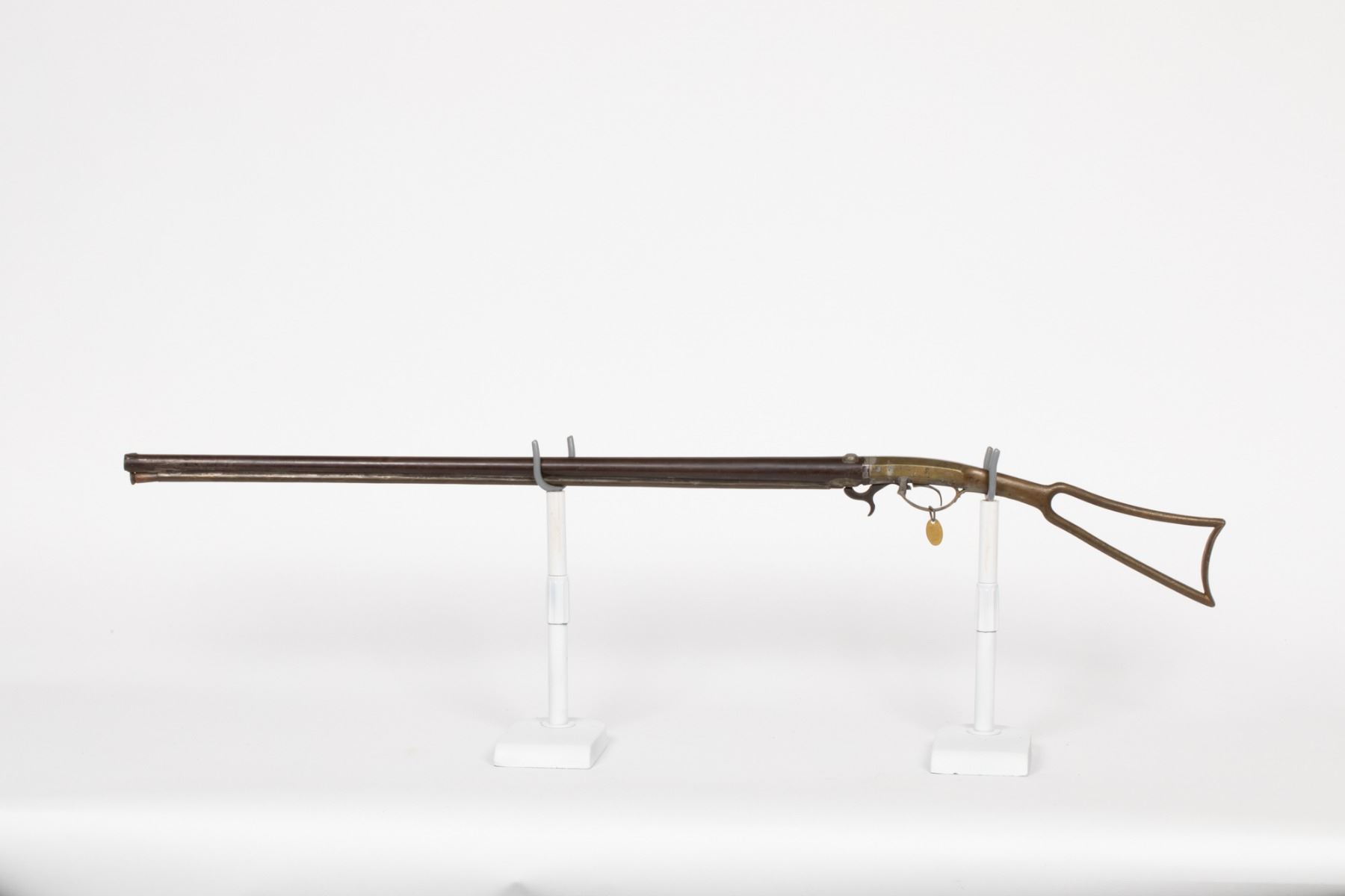 Unknown manufacturer, 16 GA, shotgun, ramrod, fixed sights, Under hammer Percussion 33" Barrel skeleton stock, metal frame shoulder stock. SN: N/A, JMD Oval Tag: 3055, Condition: Good, >