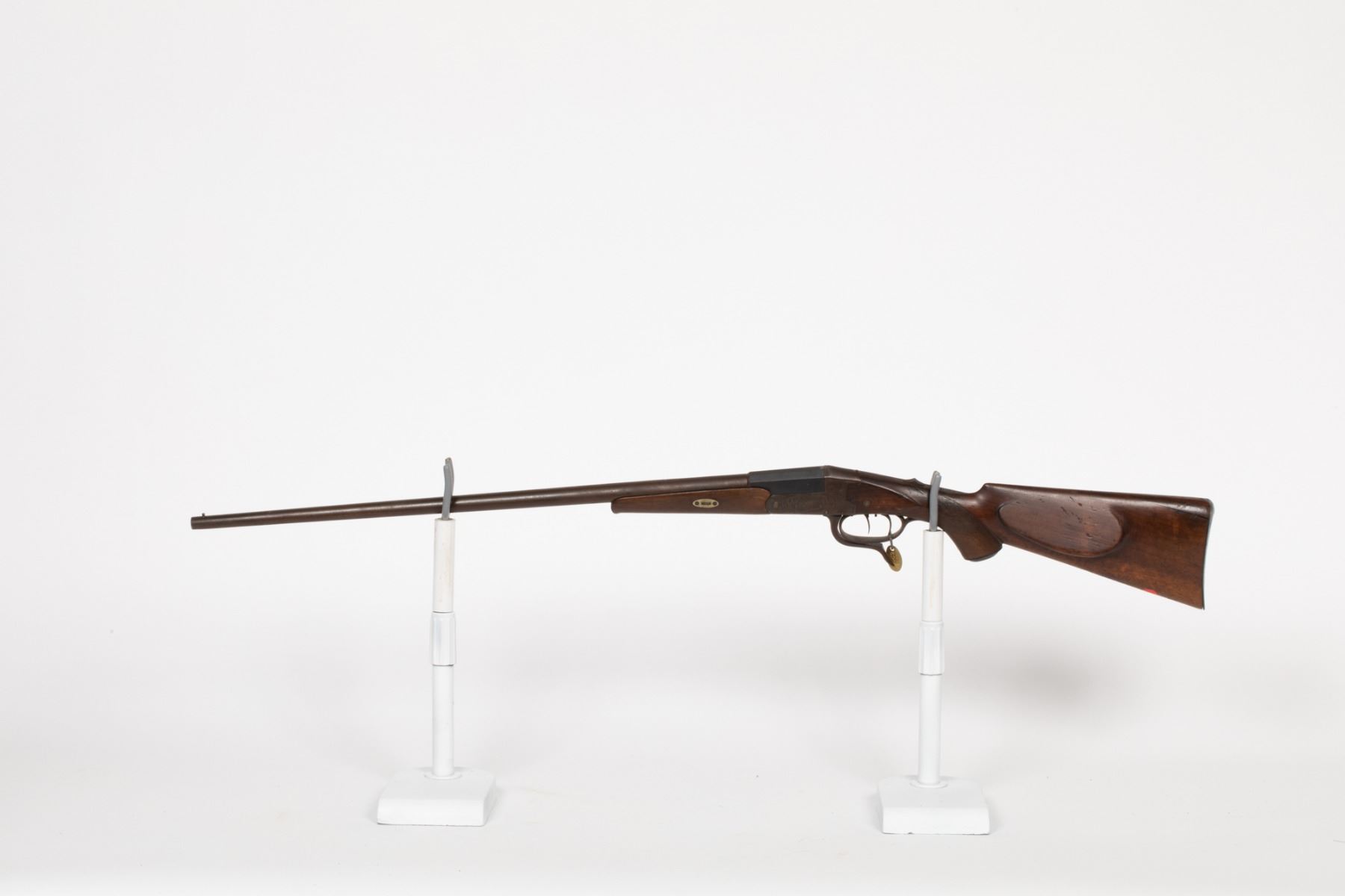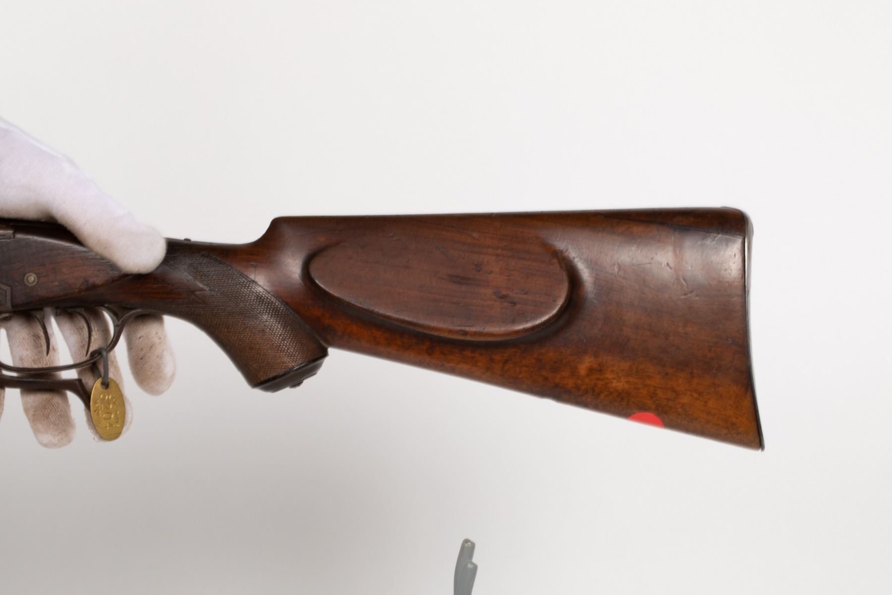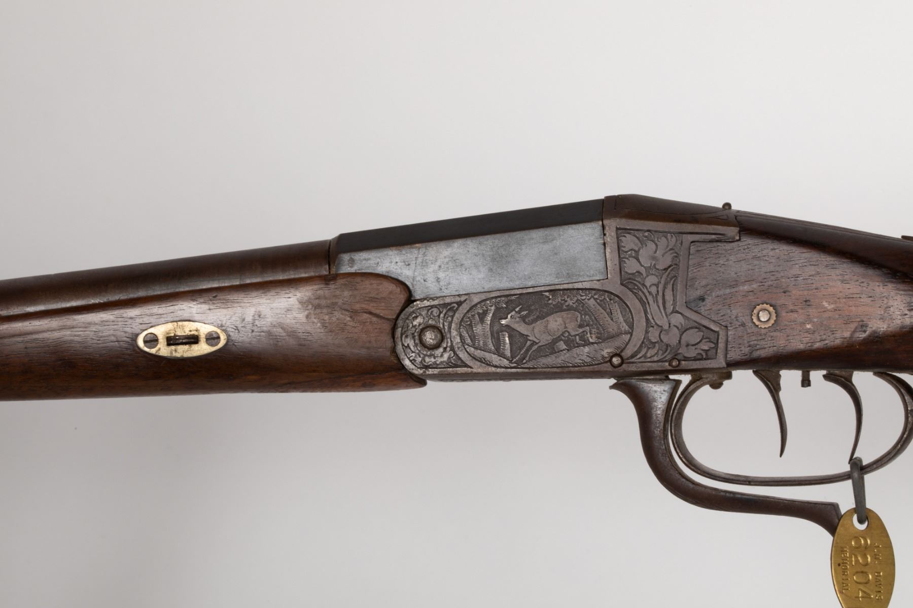 Unknown manufacturer, single barrel, dual trigger, checkered pistol grip, cheek rest, wild life scene engraved, metal butt plate, SN: N/A, JMD Oval Tag: 6204, Condition: Good, >