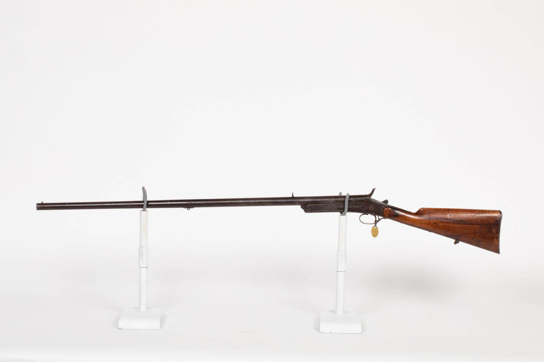 This is a single-shot shotgun, maker unknown, it has a 34 in. barrel fair condition. SN: N/A, JMD Oval Tag: 2529, Condition: Fair, >