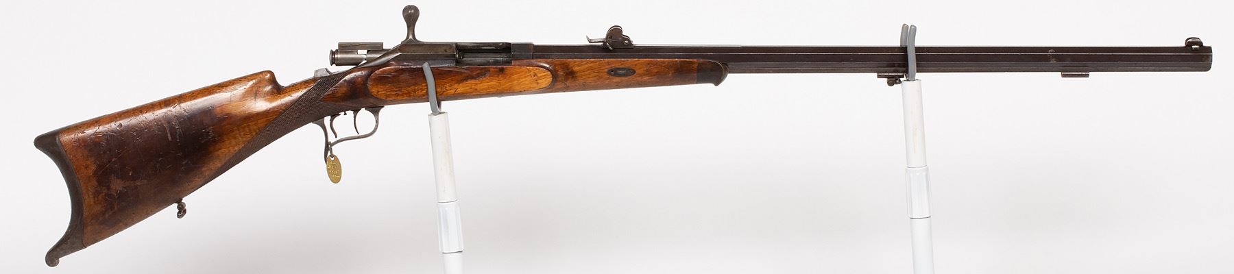 Single shot, 9mm, bolt-action target rifle, referred to as SCHUETZEN SINGLE SHOT, 1880's era. Bladed front/v notch flip rear target sights, cheek rest, 30" heavy octagon barrel, checkered pistol grip area, fancy Swiss butt plate SN: N/A, JMD Oval Tag: 3438, Condition: Excellent, >