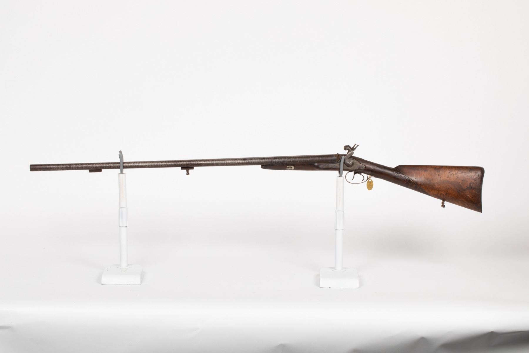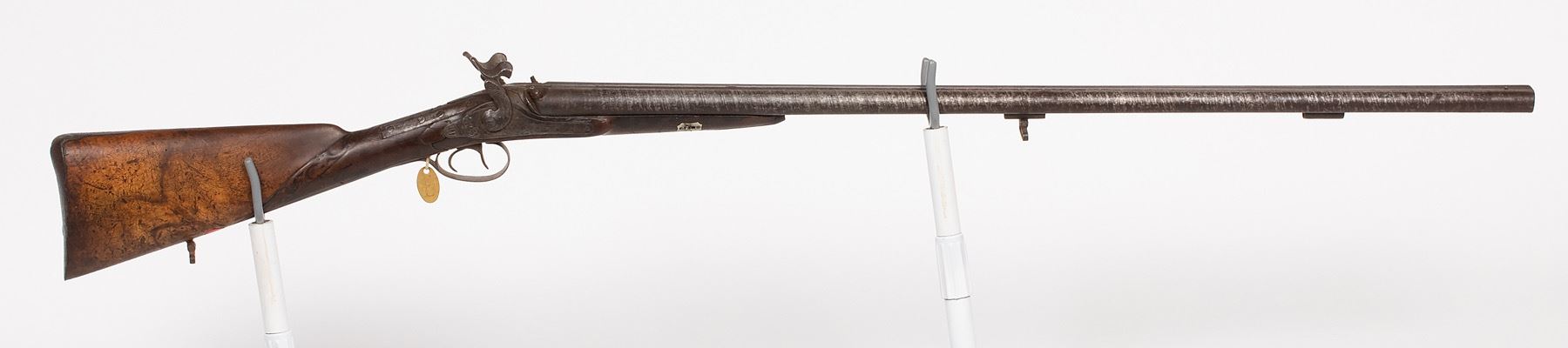 This is a double-barrel shotgun, maker unknown, c.1840's SxS 12 ga. Double-Barrel, Unknown, SxS with Damascus barrels. SN: N/A, JMD Oval Tag: 2328, Condition: Good, >