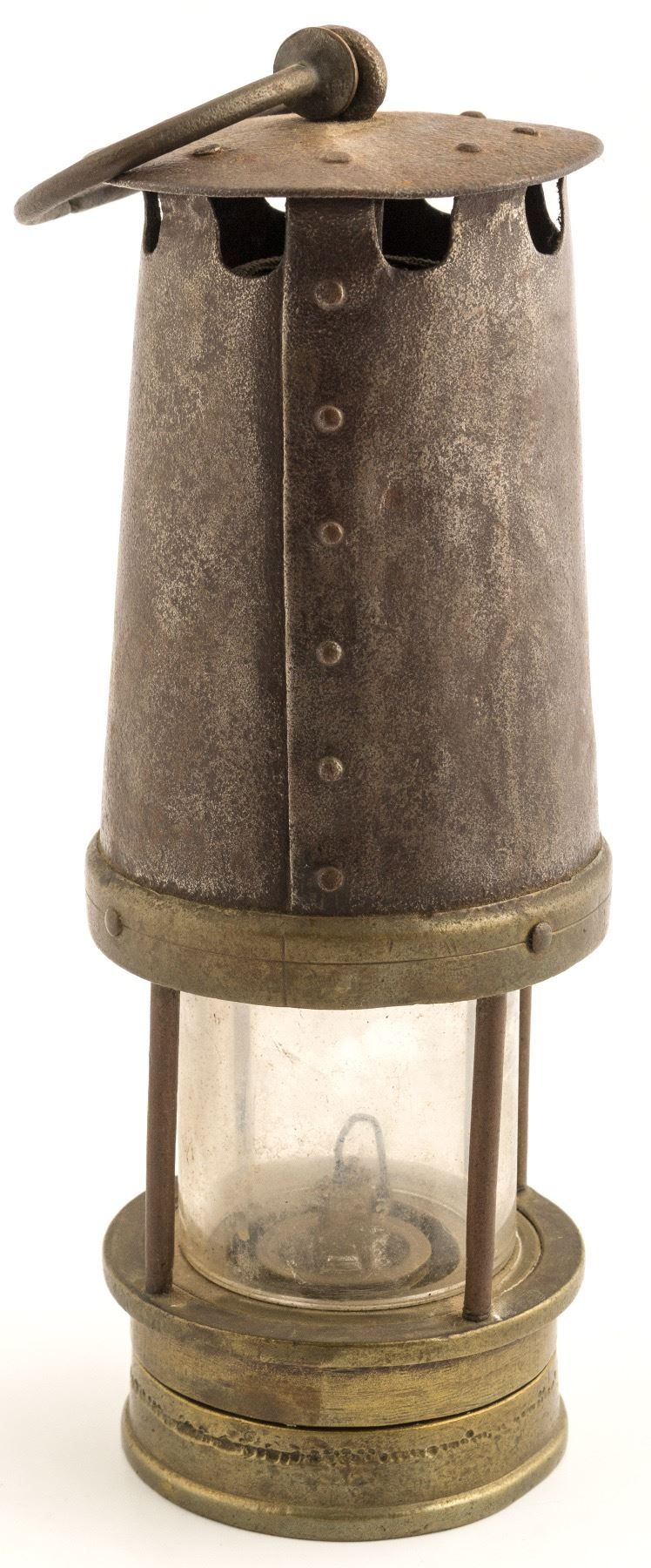 Unmarked. Tapered, riveted sleeve at top, vented. 8.75 inches tall, 3 inch diameter at the base. Cracked glass sleeve. State: City: HWAC#: 47130 Date: