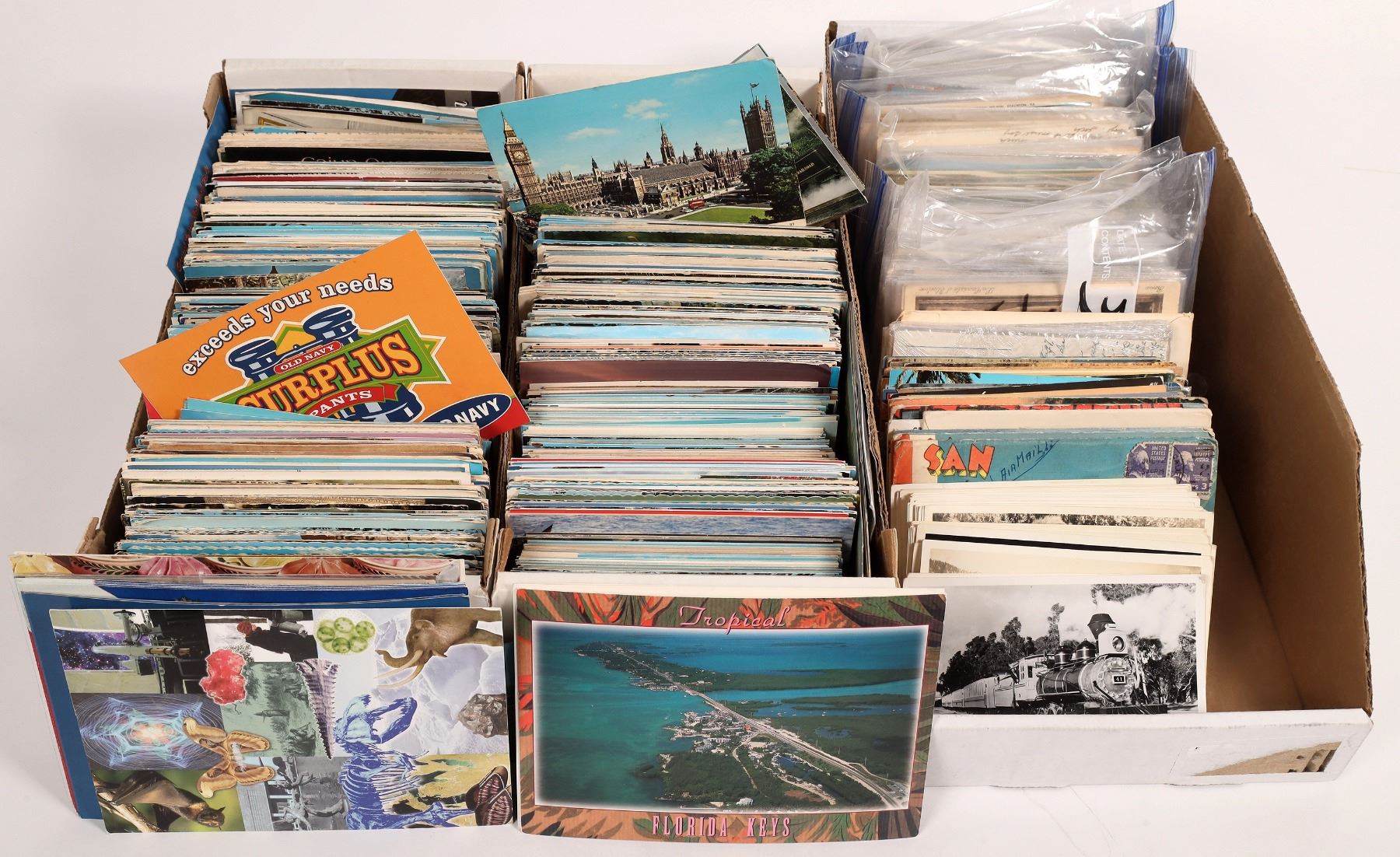 About 2500 unsorted postcards up to 1980's. Mostly US, some RPC's, historical and modern, also some Italy with lots of variety. 26 lbs.