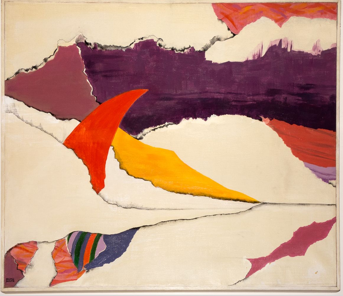 Abstract landscape acrylic painting by Ruth Hilts. (26.5" H x 20.25" W) Colors are red, violet, yellow. Some canvas warping