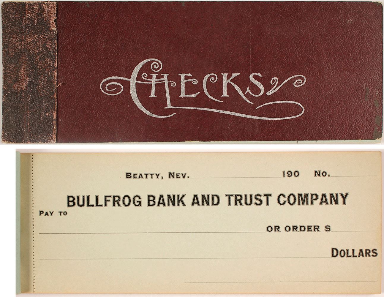 190-. Unused blue checks and deposit slips in bound checkbook. Dateline Beatty, Nev. Bullfrog Bank & Trust Company. Approx. 25 checks. 2.5 x 7" HWAC# 60001 Date: Location: Bullfrog, Nevada