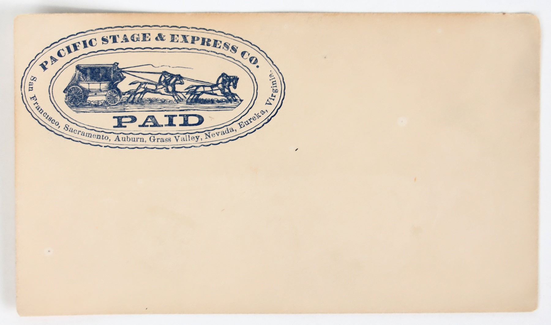 This is unused cover The Pacific Stage and Express Company. The company served, as noticed on the cover, San Francisco, Sacramento, Auburn, Grass Valley, Nevada (City), Eureka and Virginia (City). As stated, this is unmarked and in rare condition. Please see photos for more details.