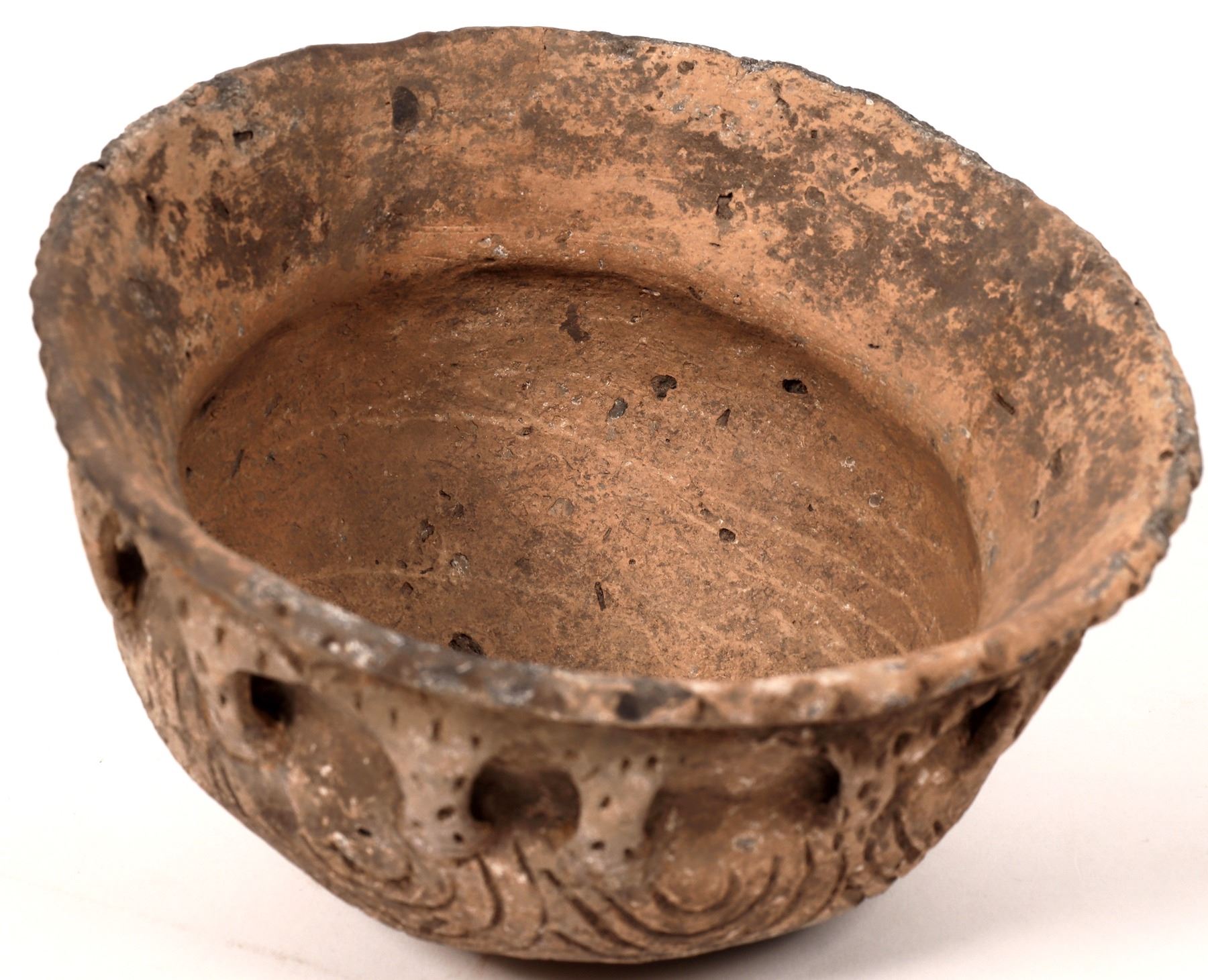 Incredible Caddo bowl, with incised arched designs and cut in arched areas (perhaps a means of suspending pot). 3.5"x 6.25".
