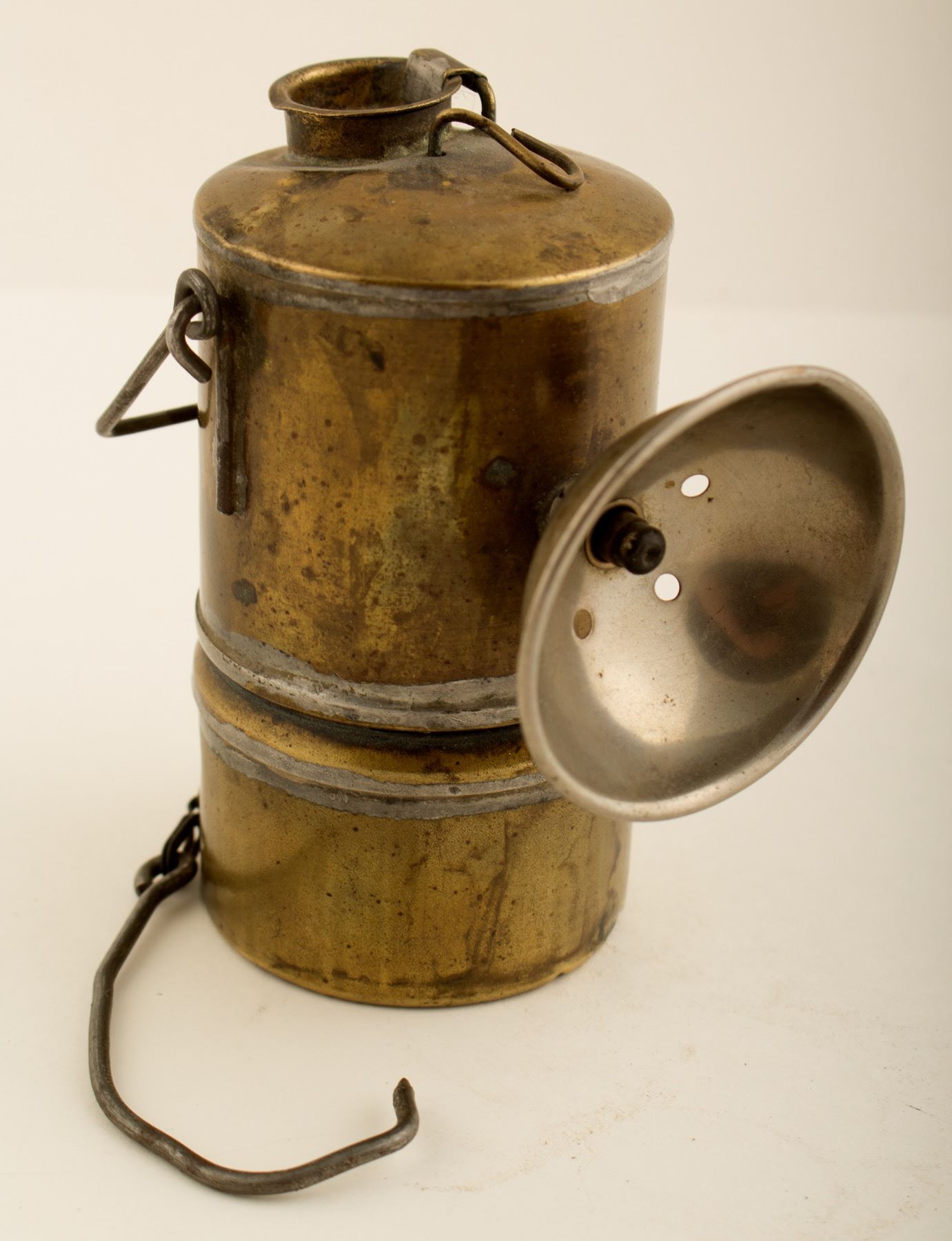 Brass. Unusual early brass lamp with the hook instead of attachment. Appears to be American construction, similar to Baldwin 36 in Thorpe. Rare and early. State: City: HWAC#: 46457 Date: