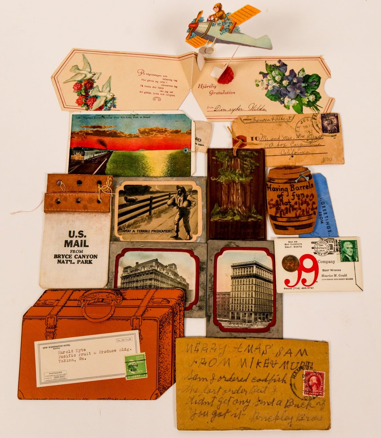There are a number of unusual post cards in this collection. There is miniaturised Postal bag with leather trim filled with small photographs from Bryce Canyon National Park with a hang tag that says" May this little bag with a view or two Lessen the miles between me and you."; there is a piece of luggage that opens to advertise the New Washington Hotel in Seattle; a cedar barrel shaped post card from San Francisco; a pop-up post card from Germany with a boy in an airplane; an a bag of salt from the Great Salt Lake dated 1928, and more. Please see the photos for more detail.