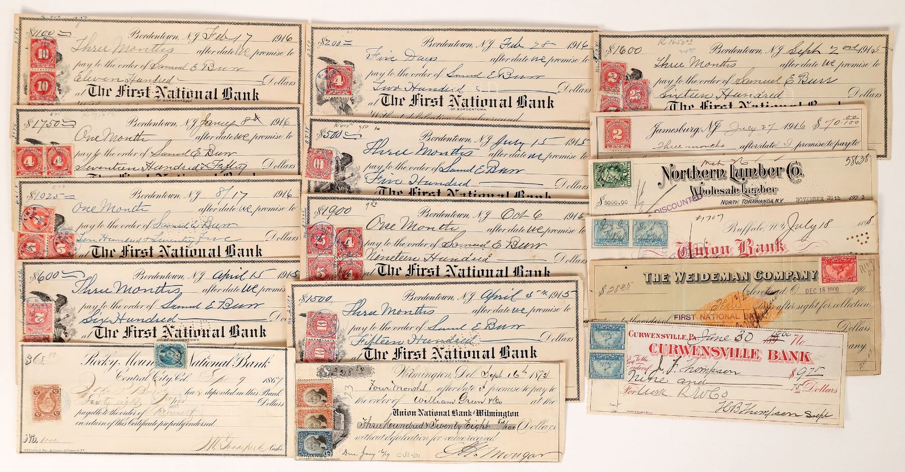 About 18 unusual revenue stamp pairs on checks c. 1867-1923. c1867-1923