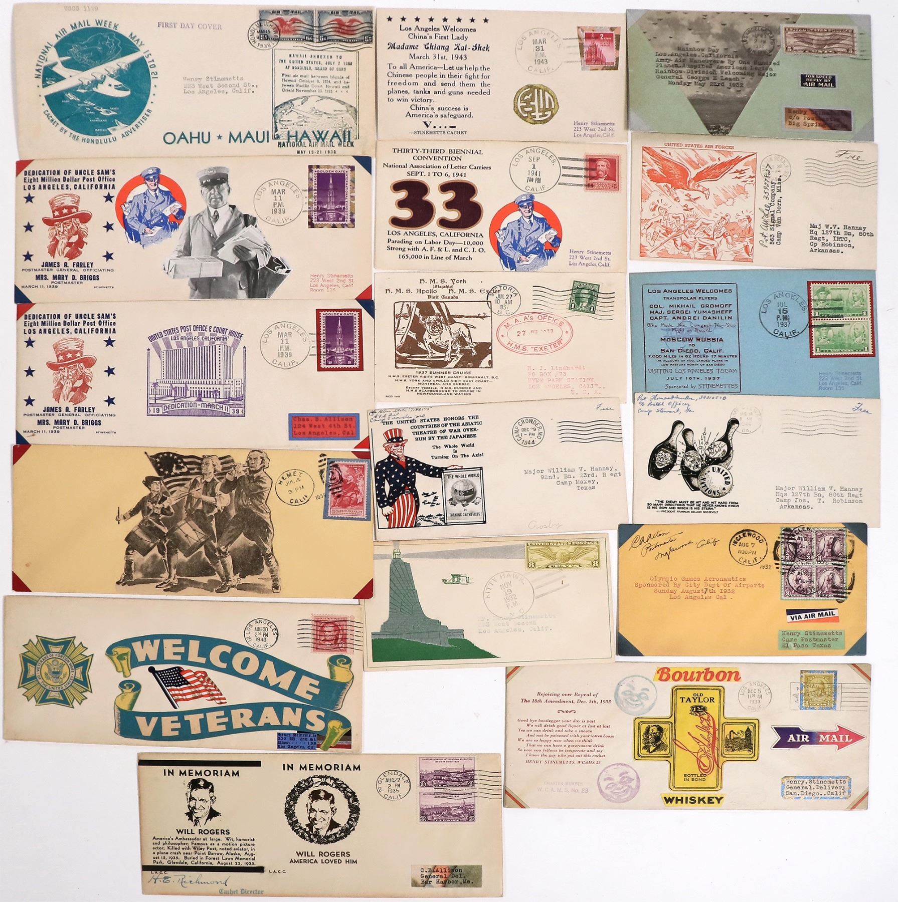 17 unusual Henry Stinemetts hand made c.c 1930's cachet covers. Bourbon, United Nations, Will Rogers, Hawaii, patriotic etc.