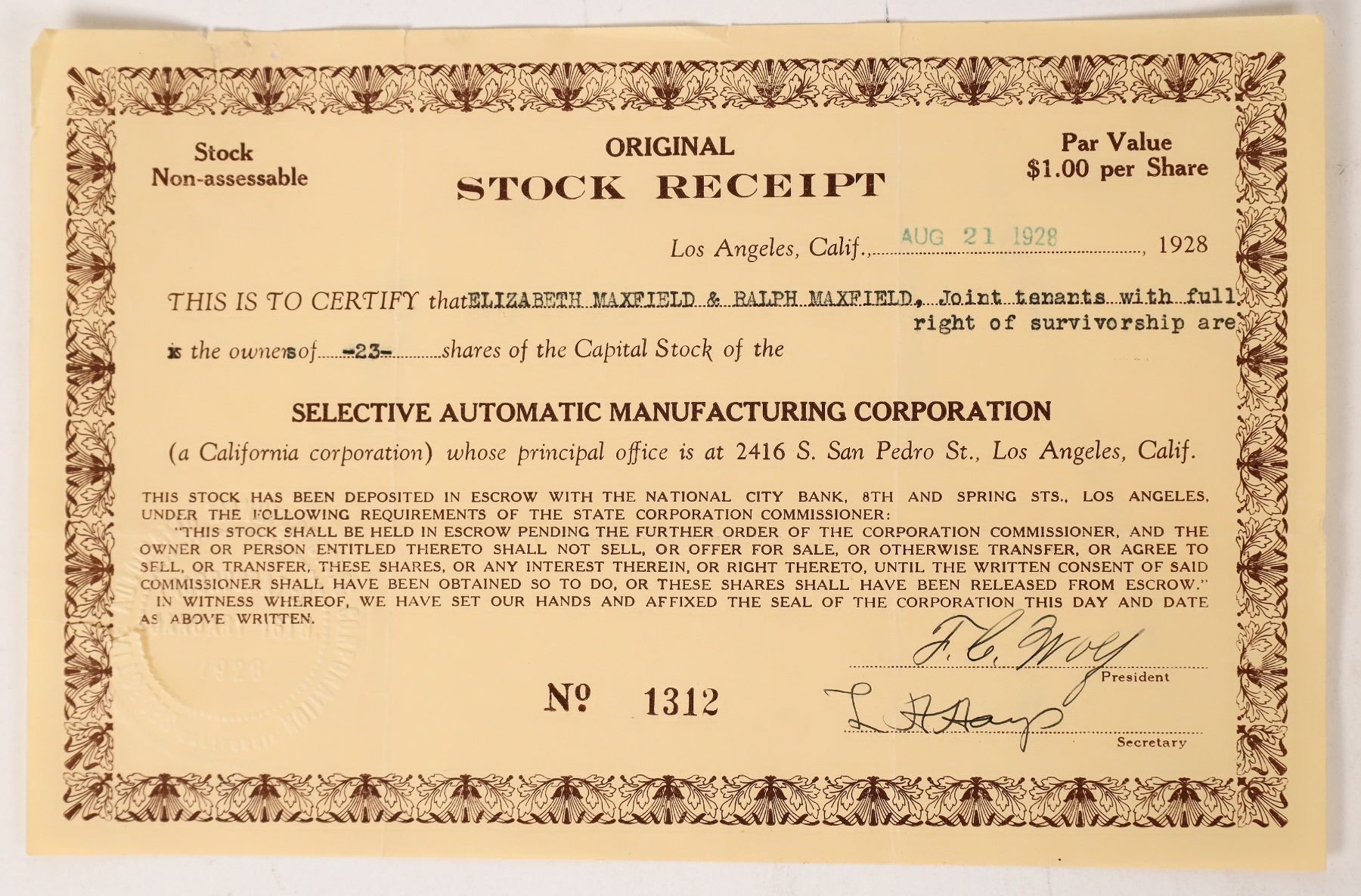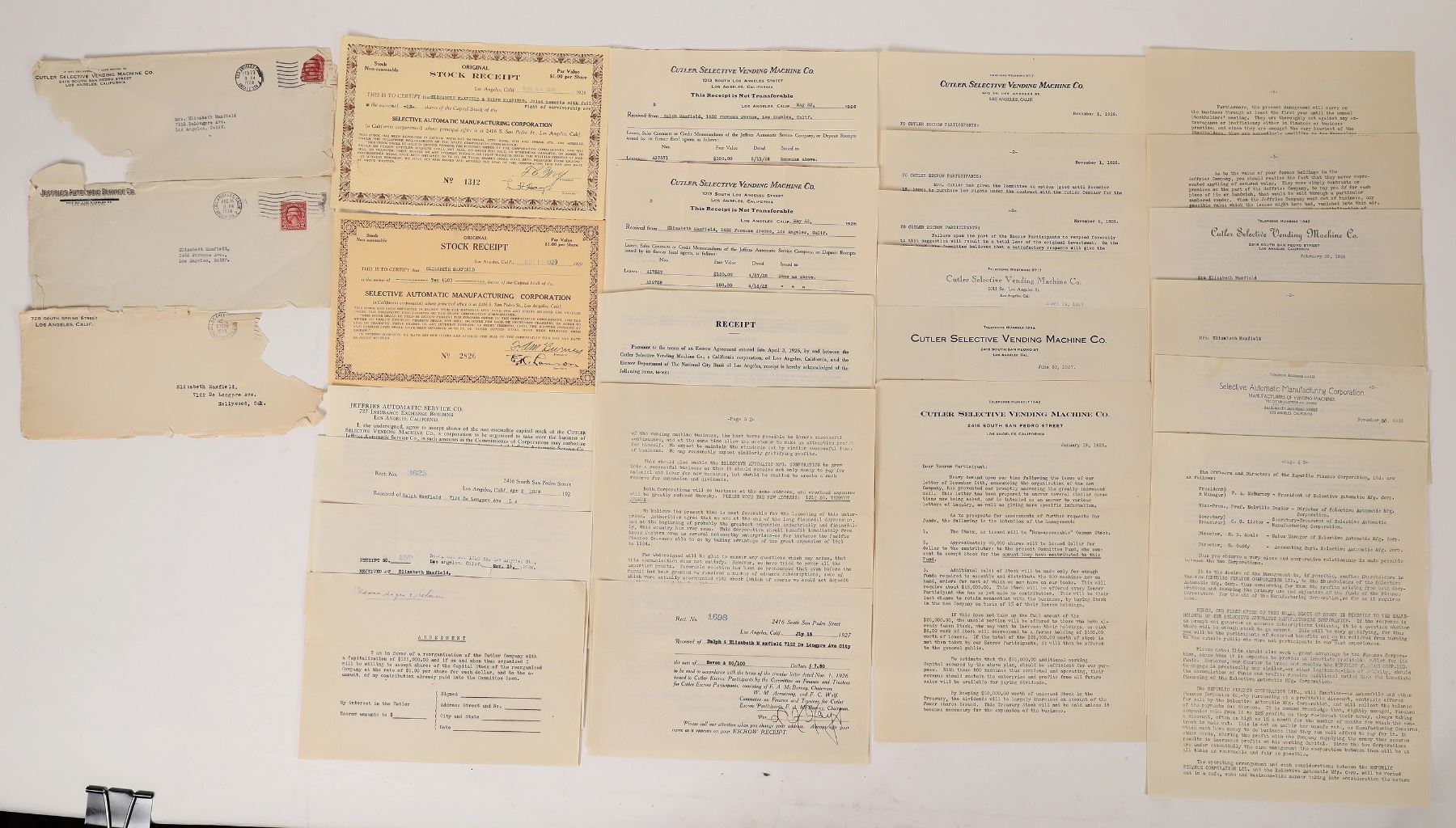 Issued uncanceled 1928 and 1929 Selective Automatic Manufacturing Corp. stock and documents related to Cutler Selective Vending, same era.