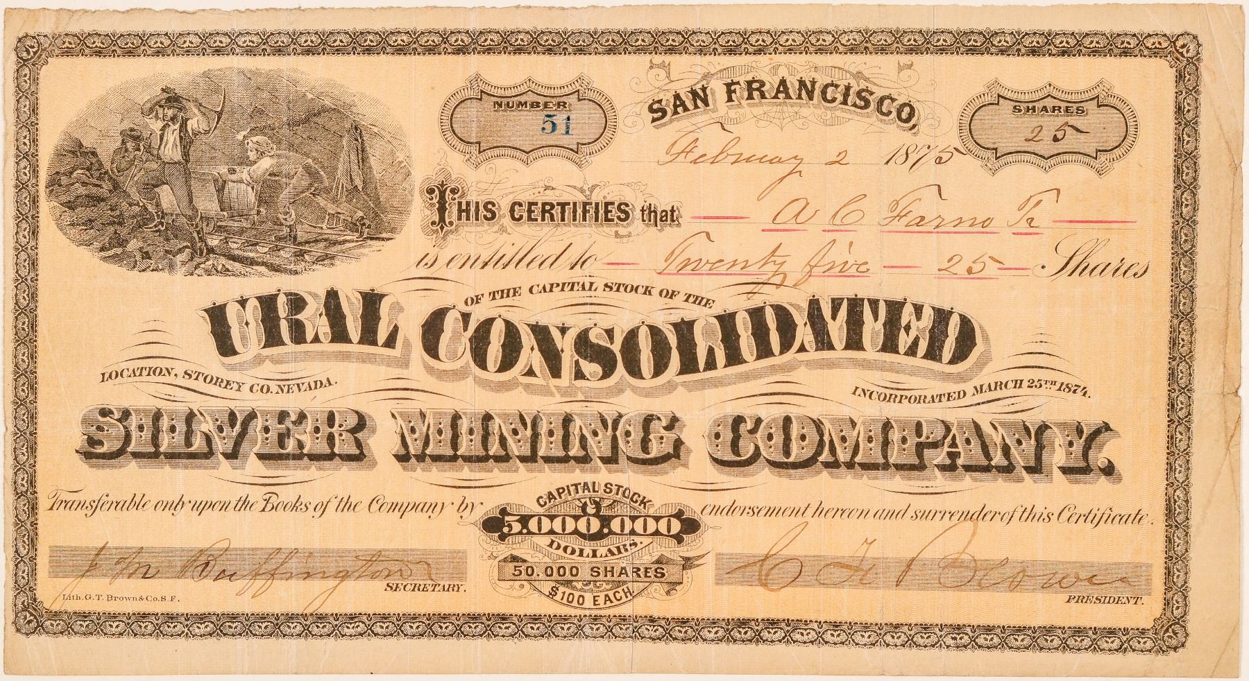 Ultra-rare. Location: Storey Co., Nevada (printed under title). Inc. 1874. No. 51, issued for 25 shares to A.C. Farno on Feb. 2nd, 1875 in San Francisco. Signed by president C.F. Brown and secretary JM Buffington. Not cancelled. Black border and print. Yellow background inside border. Fancy company logo and mining vignette. Printed by noted African-American lithographer G.T. Brown. Folds, many creases, some edge wear. 5 x 9.25" Not listed by Ansari. The Ural was north of and adjoining to the Sutro Mine on the Western ledge (Cedar Hill area). "Little has been done in developments except to hold the claim." [Ref: Annual Mining Review and Stock Ledger, 1876, pg. 71] Ken Prag Collection