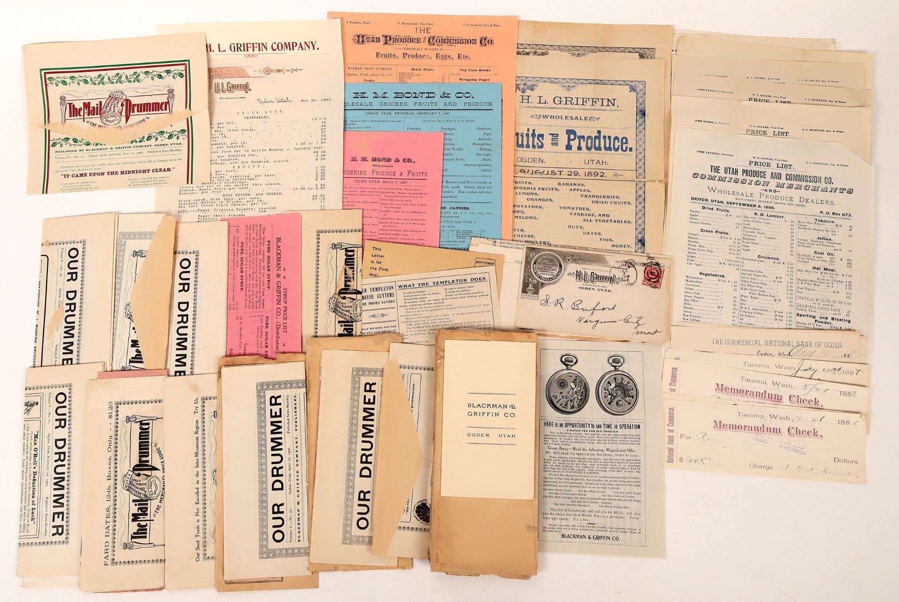 About 35 Utah product advertisements, checks, advertising covers, pricelists, letterheads. Fruit, gum, syrup, cheese cutter, vegetables etc. c. late 1800's. c. late 1800s