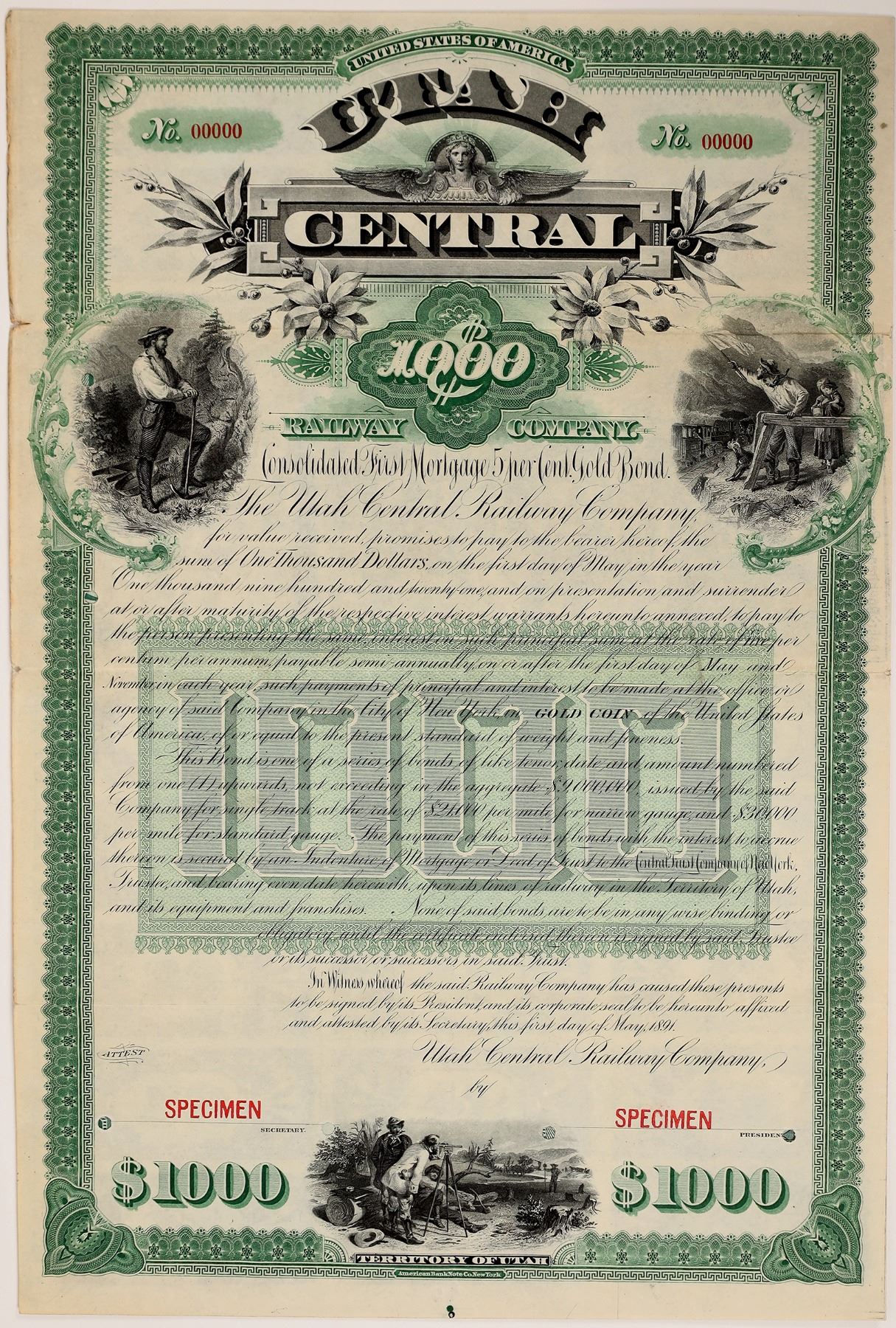 $1,000 specimen bond #00000. Green border, black print, fancy title, and three vignettes (one mining, one railroad, and one surveying). Printed by ABN. Stamped Specimen across signature lines. Also hole punched. Two full sheets of coupons attached, also hole punched. 13.5 x 9" Folds, creases. The Utah Central Railway was a Union Pacific subsidiary that ran south from Ogden to Frisco, Utah. It was a merger of the Utah Central Railroad, Utah Southern Railroad, and Utah Southern Railroad Extension. It was subsequently merged with several others in 1889 to form the Oregon Short Line and Utah Northern Railway, which was reorganized as the Oregon Short Line Railroad in 1897.