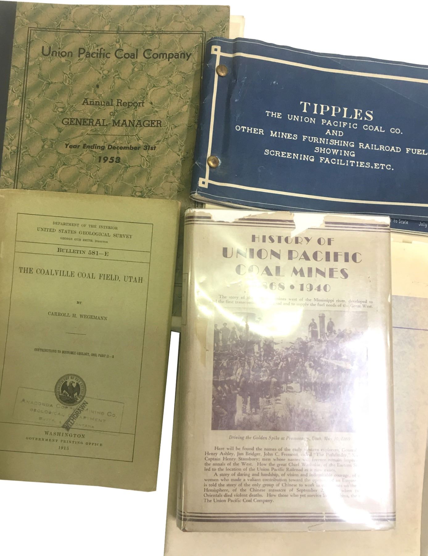 UT coal booklets-Coalville Coal Field, History of Union Pacific Mines, bound Union Pacific blueprint form of screening facilities, original typed Union Pacific Coal Co 1953 annual report, 2 large Southern Utah Fuel Co mine maps