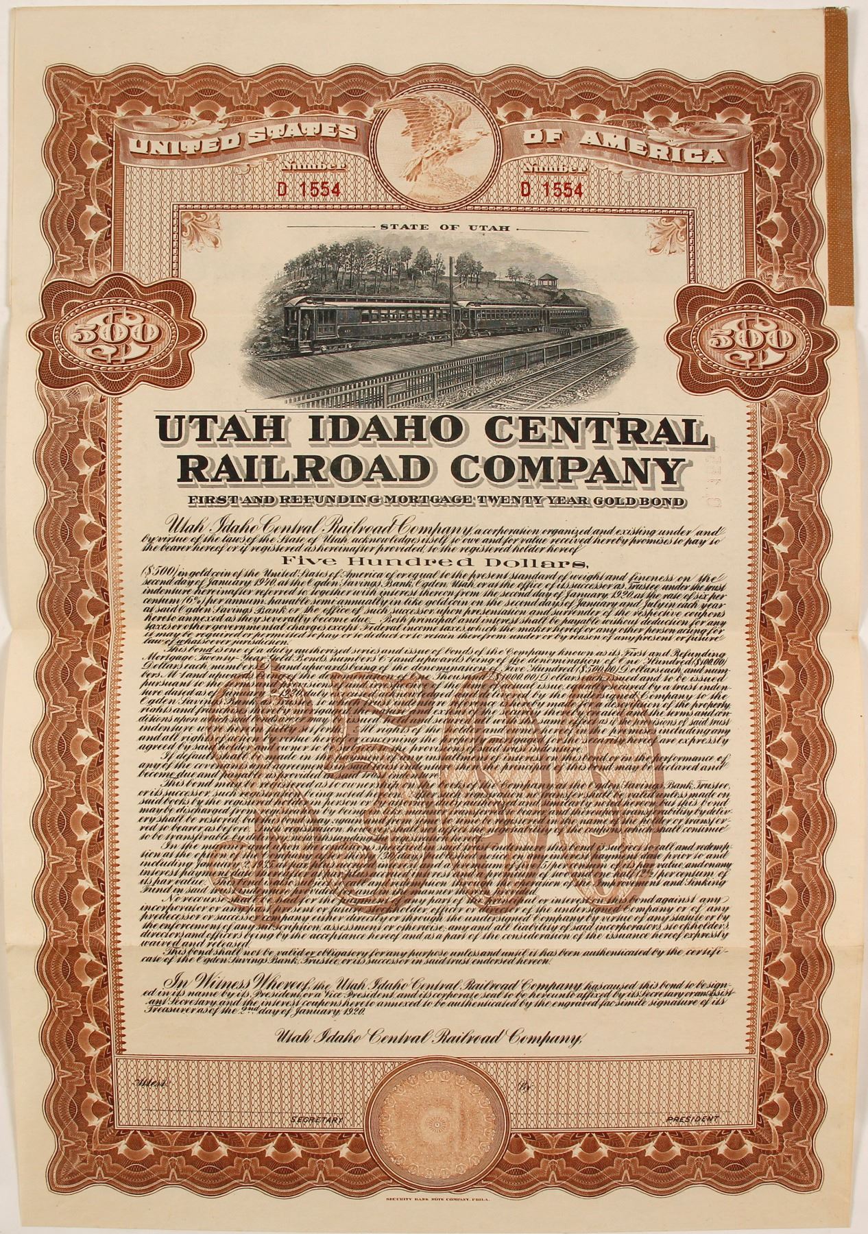 incorporated in 1918 State of Utah. Formation of company was the result of Cache Valley Railroad being merged with the Ogden, Logan and Idaho. Bond # D1554 for $500 20 year First and Refunding Mortgage, 6% 20 yr bond due January 2, 1940. Set to be issued 2 January, 1920, unsigned. no company seal, coupons attached w/none missing Rust color, vertical format, vignette Three long inter-urban cars, platform in foreground, hill behind. Appears unissued. Folded in quarter folds but appears in fine very fine shape. Printer : Security Bank Note Co Phila. Ken Prag Collection