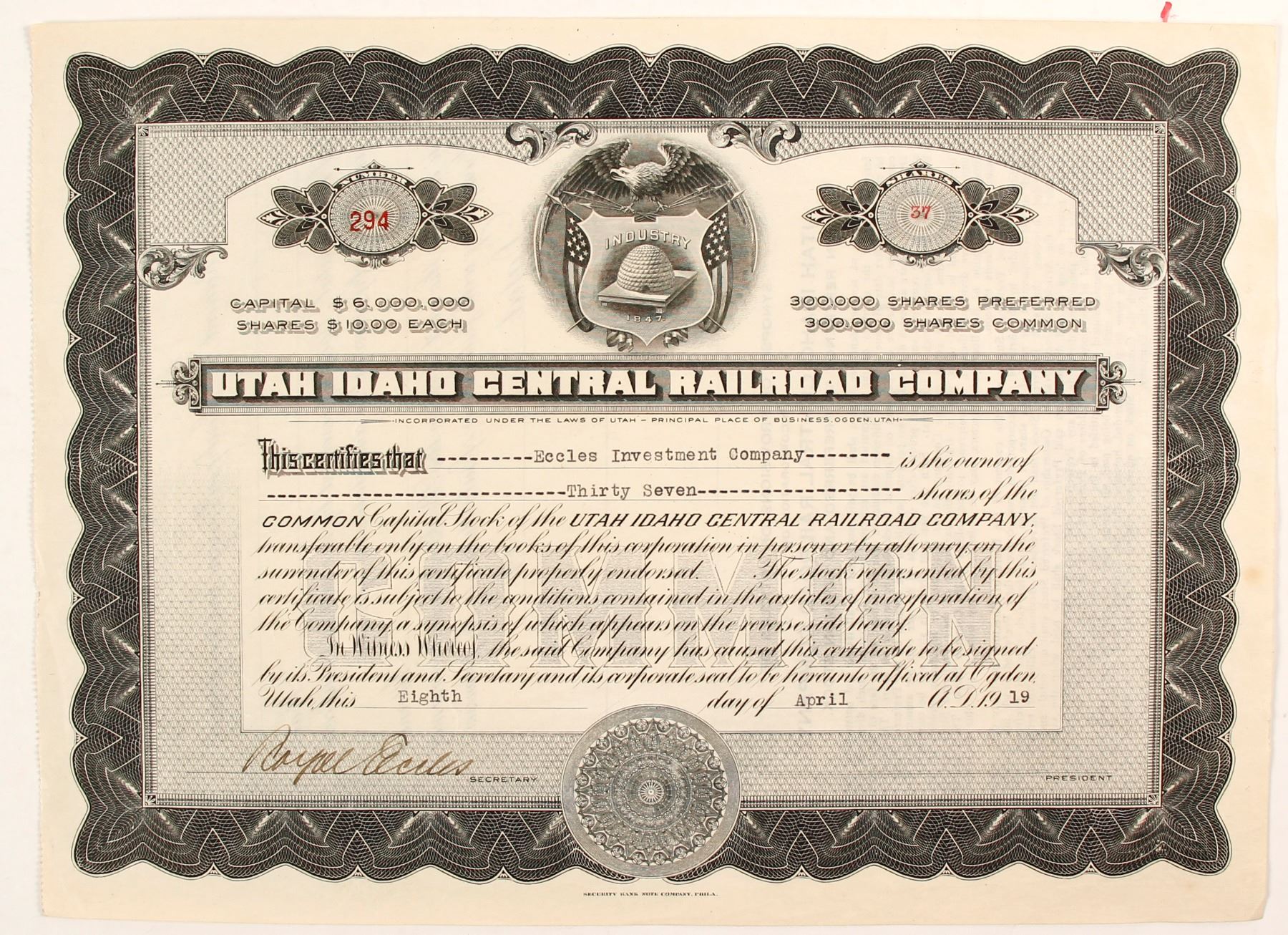 incorporated State of Delaware January 1 1918 from the former Ogden, Logan & Idaho Railway. Stock Cert #294 for 37 shares common stock , issued to Eccles Investment Co 8 April, 1919 signed Roger Eccles Secretary, no President signature, no company seal. Printer : Security Bank Note Co Phila. Black border, vignette: eagle looking r-l perched on shield, "industry" "1947" on shield with bee hive, American flags on both sides of shield.,word "common in underprint. iu Ken Prag Collection