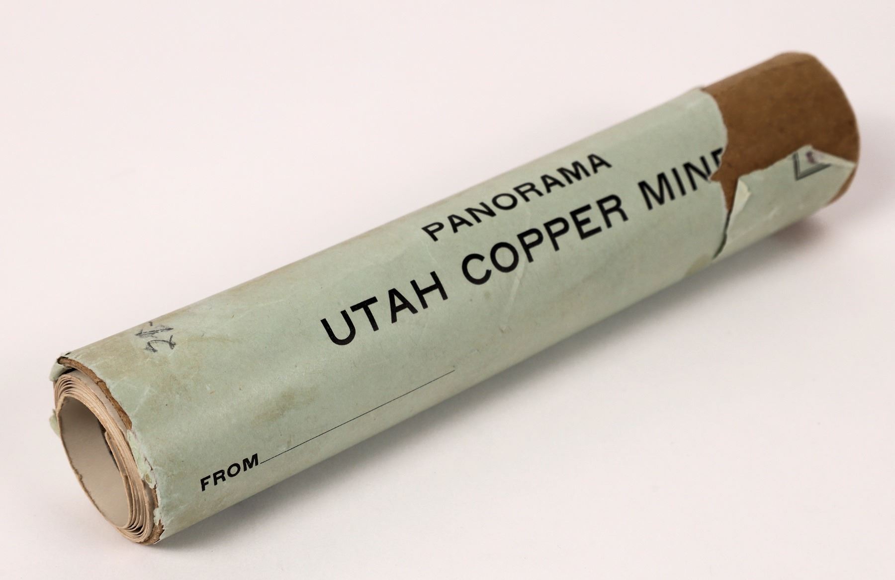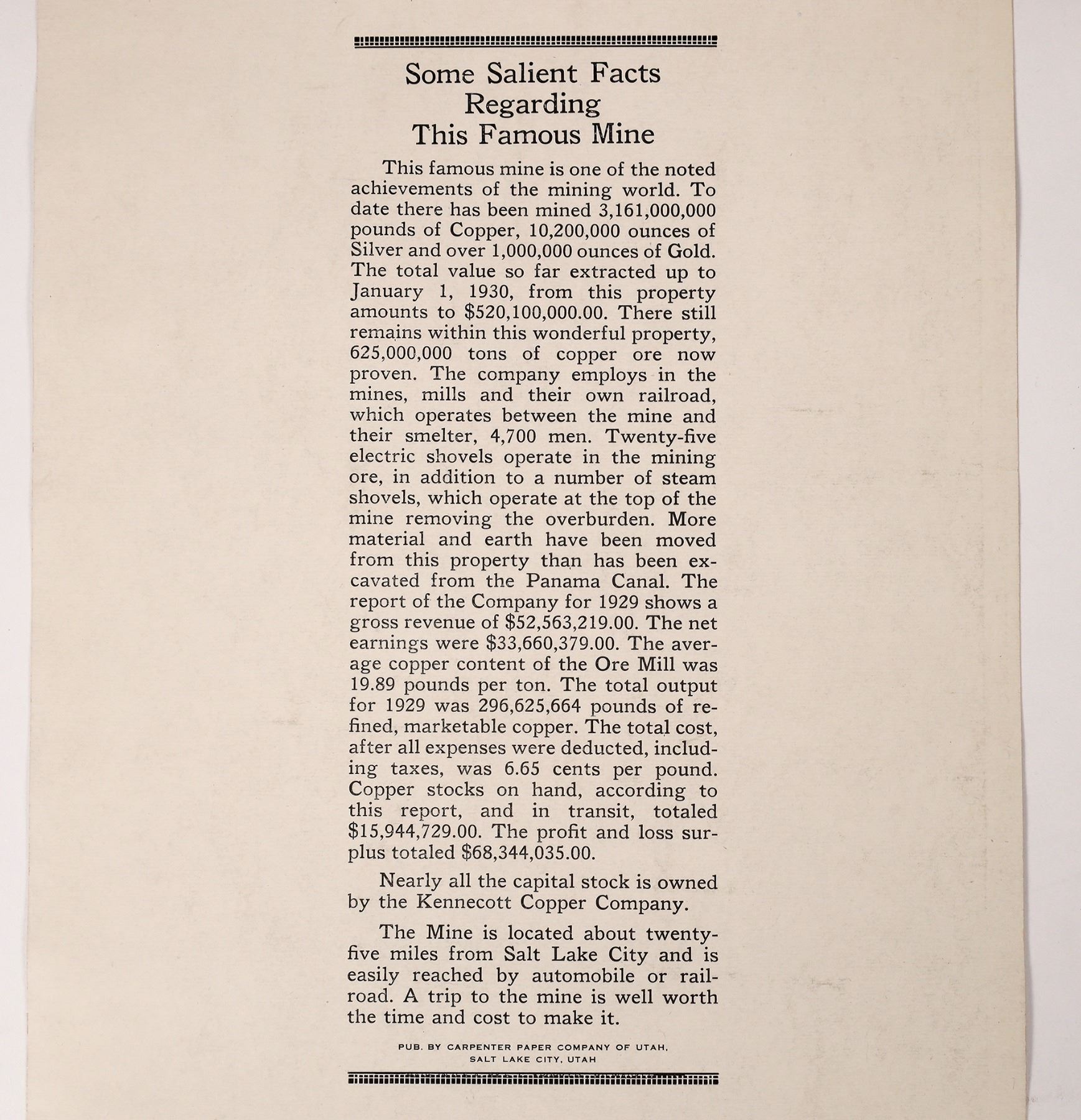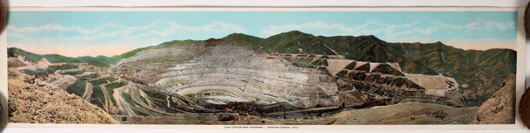 Color panorama of the Kennecott copper works. Facts about the mine and its value included on the verso. Located in Bingham County. c1930