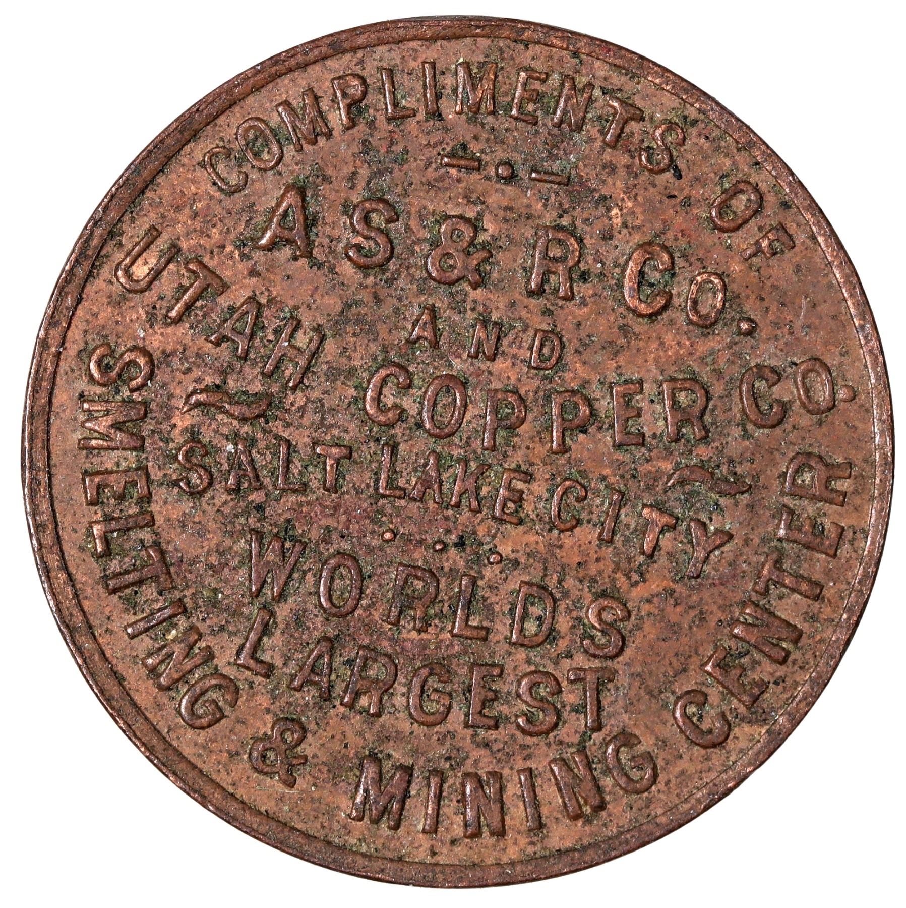 Obv.: Utah Lions Club / L / 1938; Rev.: Compliments Of / A. S. & R. Co. / Utah Copper Co. / Salt Lake City / World's / Largest / Smelting & Mining Center; Br., rd., 25 mm. [Salt Lake City] [Utah]