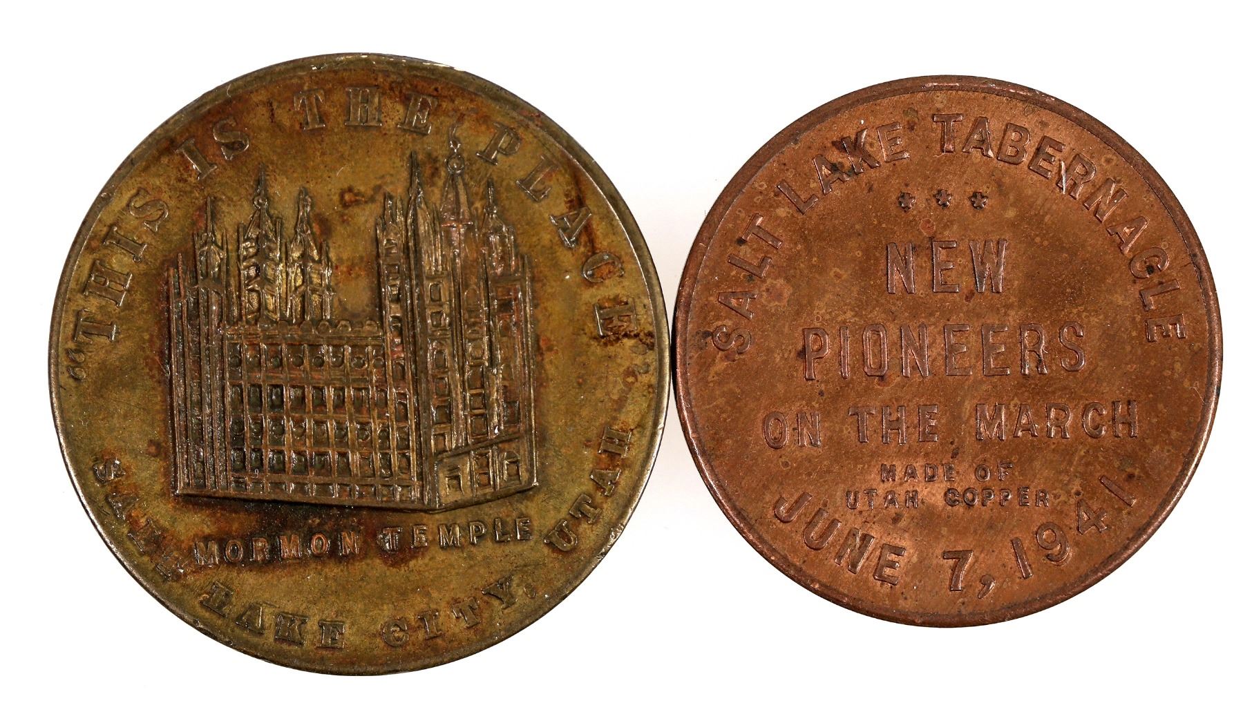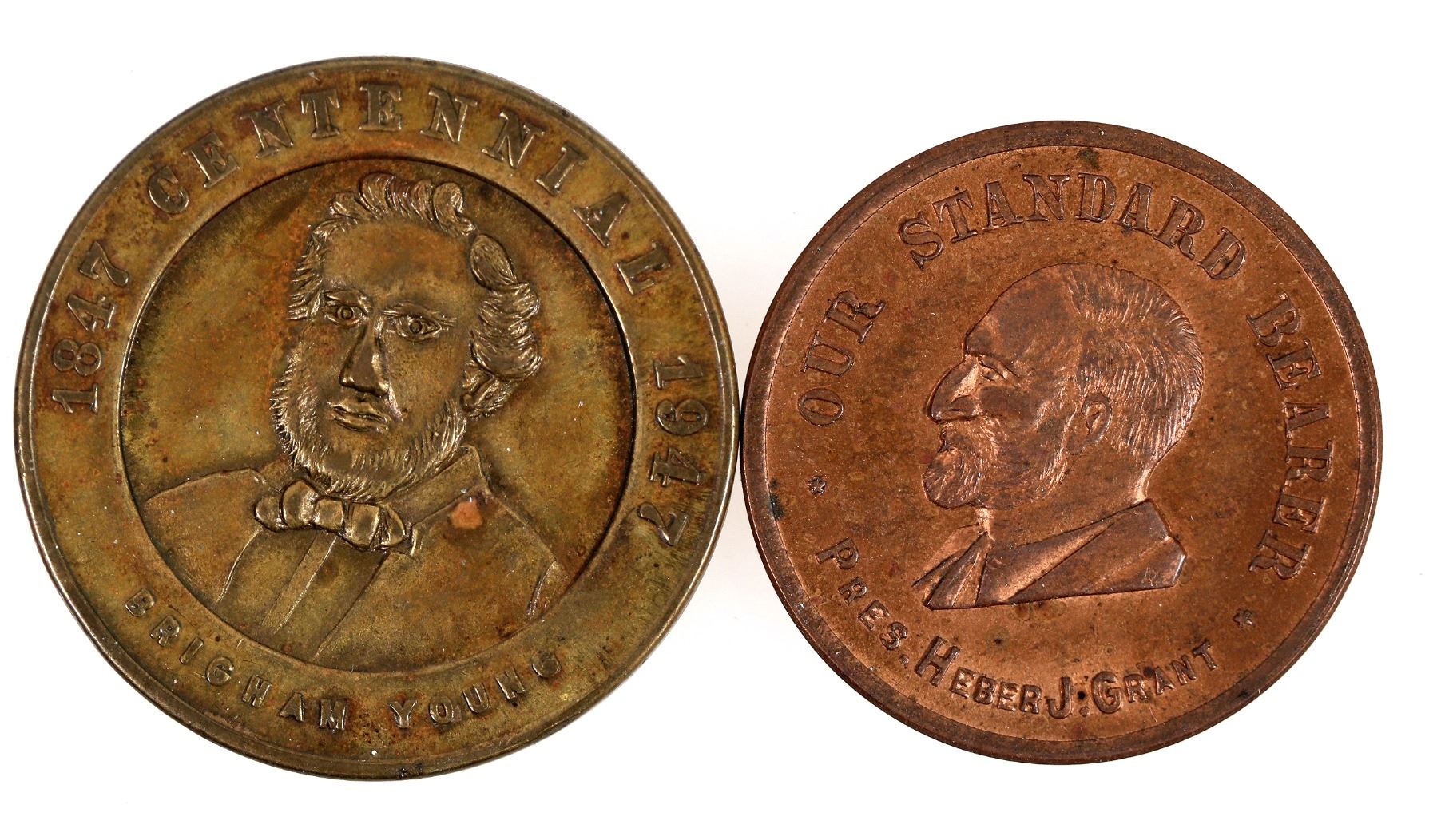 Two medals from Salt Lake City: 1) "This Is The Place" / Salt Lake City Utah / Mormon Temple (pictorial) // 1847 Centennial 1947 / (portrait) / Brigham Young; Br., rd., 32 mm. 2) Our Standard Bearer / Pres. Heber Grant // Salt Lake Tabernacle / New / Pioneers / On The March / Made Of / Utah Copper / June 7, 1941.