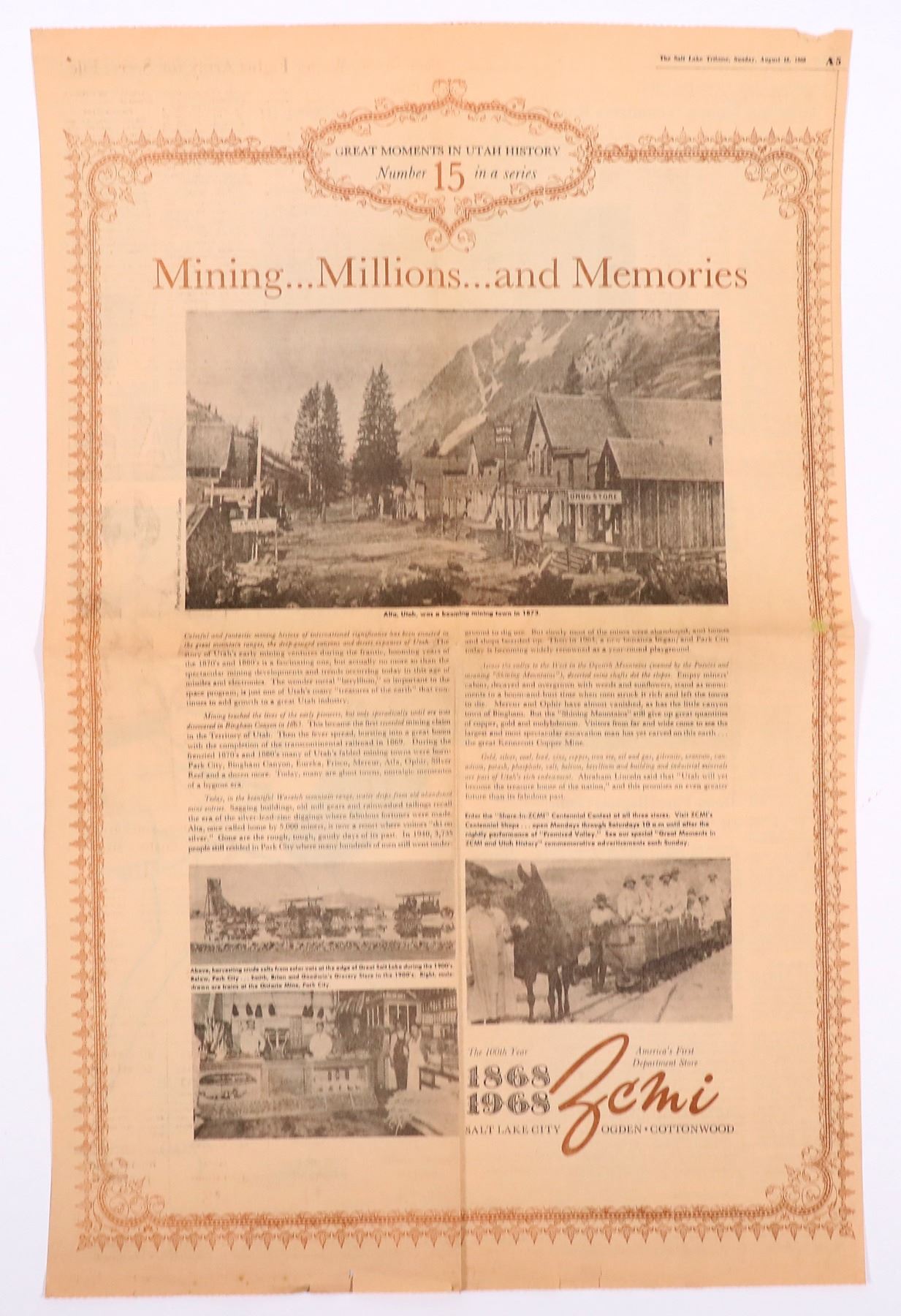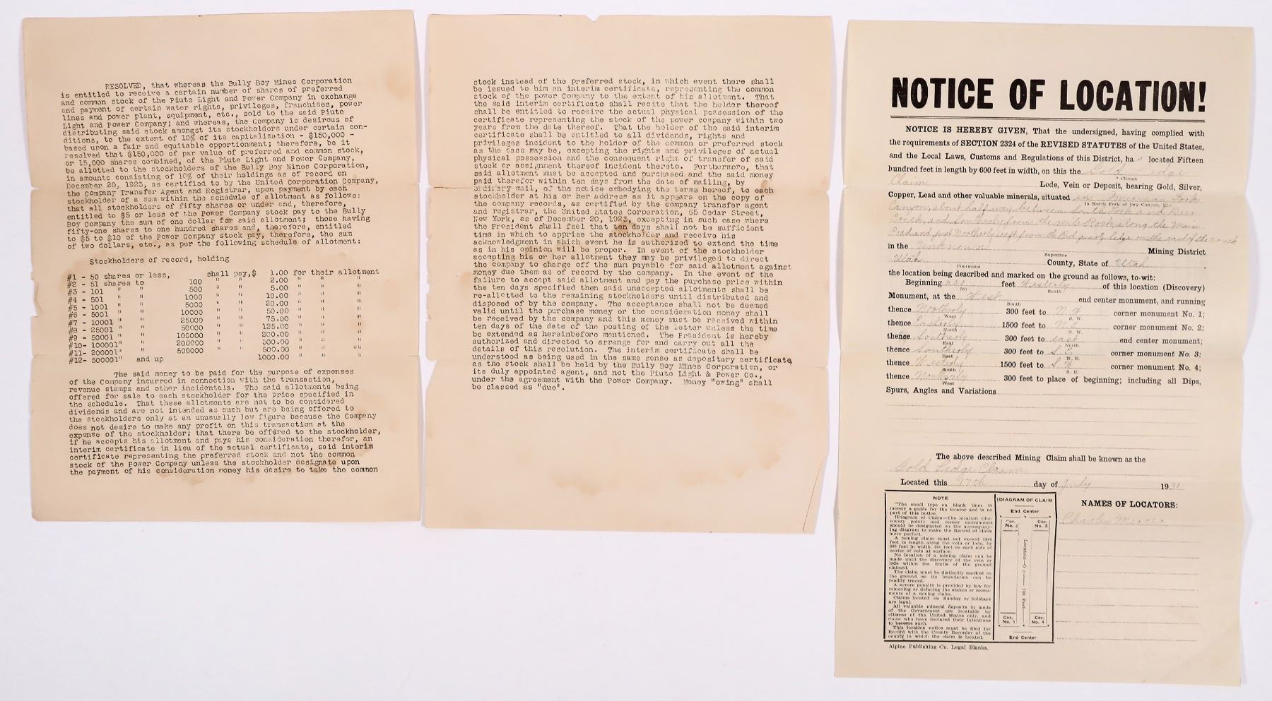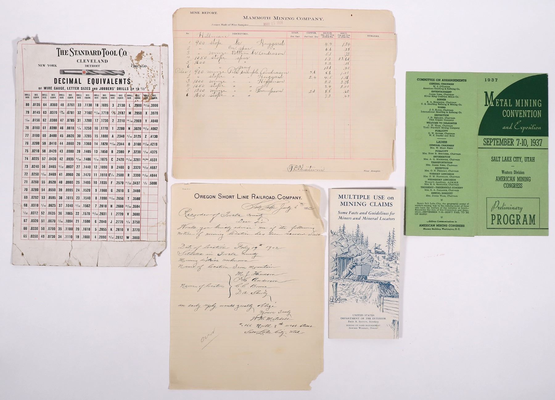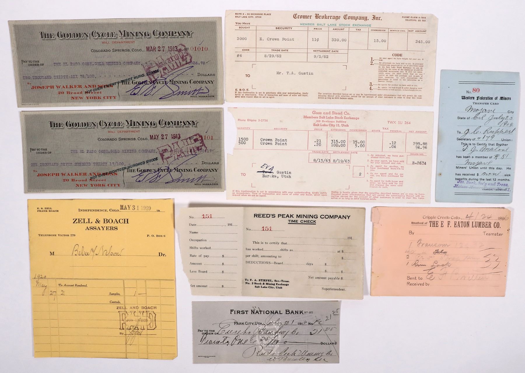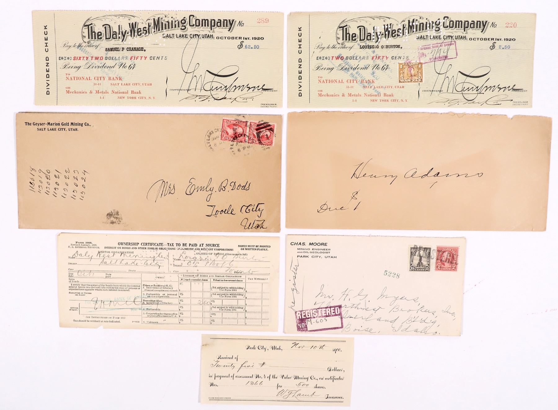 About 20 pieces of Utah mining ephemera. Park City, SLC, Grand Gulch, etc. Billheads, letters and covers, photos, mine report, checks etc. Utah Geff Pollock Collection