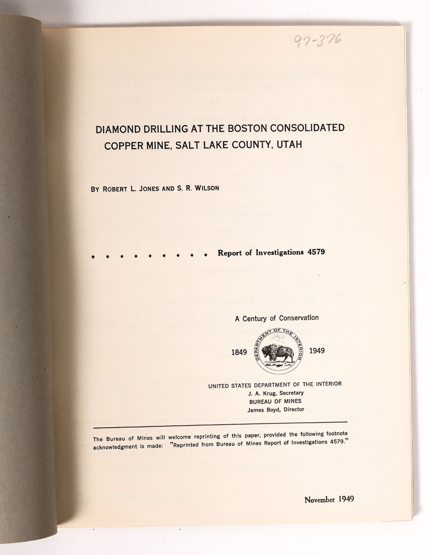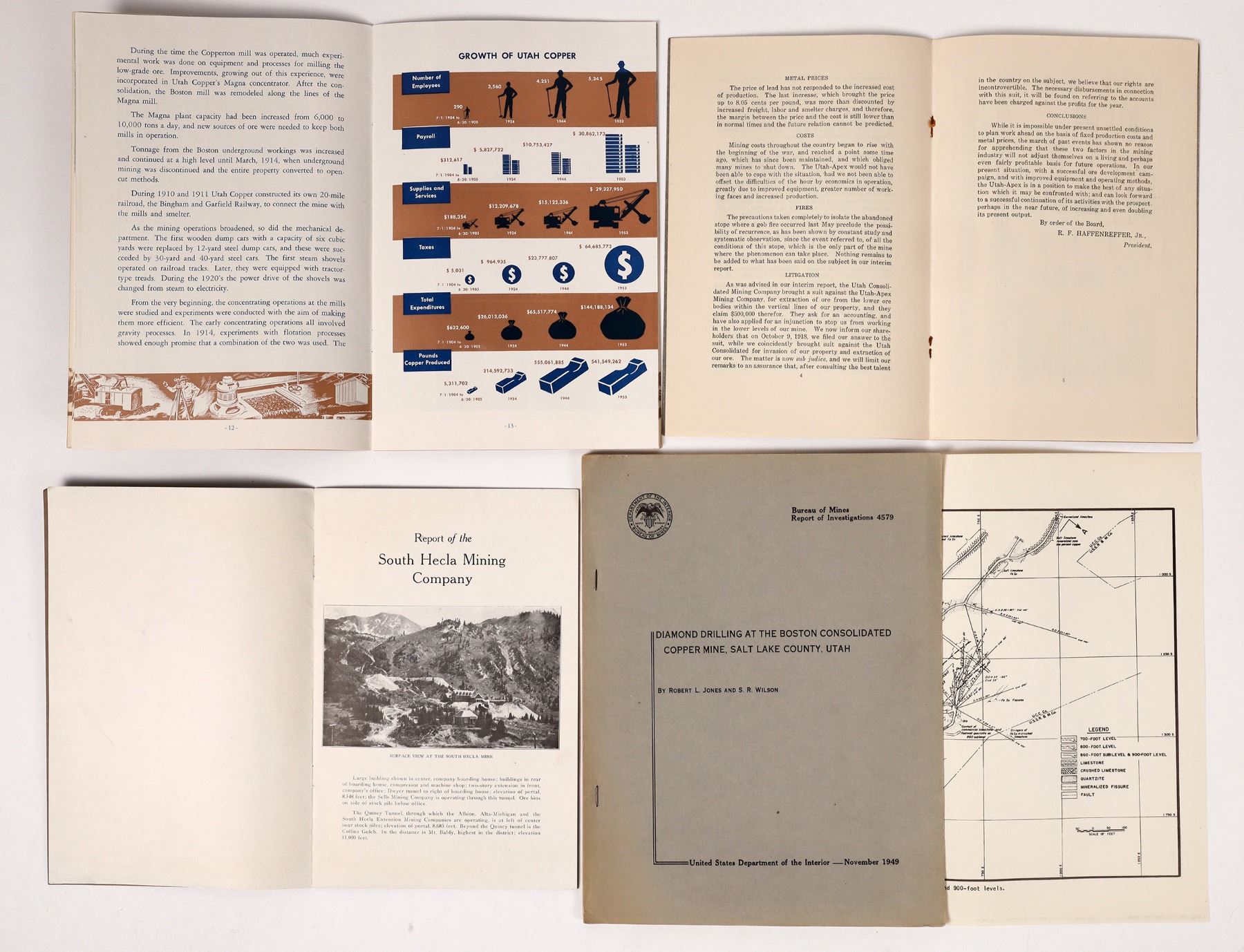 Lot of four. 1) Utah-Apex Mining Company 1918 annual report. Seven pages with financial reports and information on the last year. 2) 50th Anniversary of the Utah Copper Story by the Utah Copper Division and Kennecott Copper Corporation. 1954. 23 pictures. One tri fold picture. One graph on the growth of Utah Copper. 3) Diamond Drilling at the Boston Consolidated Copper Mine, Salt Lake County, Utah. 1949. By Jones & Wilson. 21 pages with lots of graphs, two pictures, one diagram, one map and one fold out map. 4) South Hecla Mining Company annual report, 1920. Graphs and one picture of a view of the mine.