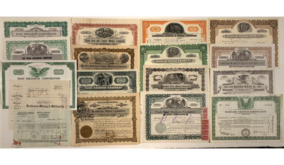 Second group of sixteen Utah mining related stocks.1)Utah Gold and Copper Mines Company (AZ), issued in 1909. Mine office was at Newhouse, Beaver County, Utah. Lands, 30 claims so. Of Newhouse in the Washington district of the Needle Range Mountains, also 160 acres at State Line, Iron Co. The Beaver County lands included the Blue Bell group. Unc. 2)Pacific Gold and Copper Mining Company (SD), issued in 1904. Possibly Utah, though we couldn't nail this one down. Three mining vignettes. Unc. 3)Syndicate Mines Company (OK), issued at Chicago, Illinois in 1906. Mines located near Santaquin, Utah County. X cancelled. 4)Bradshaw Mining and Milling Co. (UT), issued in 1908. Mines located in Beaver County, Utah printed at left. Low cert. #5. Not listed in Copper Handbook. 5)Ohio Copper Company (ME), issued in 1911. Mine office was at Bingham Canyon, UT. Nice mining vignette. Unc. ABN. 6)Santaquin King Mining Company (UT), issued in 1912. Mines in the Santaquin district, 65 mi. SE of Salt Lake City, adjoining the Santaquin Chief. Miners working underground. Unc. 7)Utah Coal Railway Company (UT), issued at S.L.C. in 1914. The word "Coal" in the company name is crossed out. Since this is a coal railway, we included it with these Utah miners. This railroad was listed as a non-operating subsidiary of the Denver & Rio Grande R.R. in 1915-16. In 1917, it was independent and ran from Utah Railway Jct. to Thistle. In 1926, it leased the 8.7 mile National Coal Railway, which ran from Darrah to Union, until abandoned in 1954. Revenue stamps and mining vignette. Stamp cancels and part of stub attached at left. 8-9)Walker Mining Company (AZ), issued in 1936,1937. One in brown and one in green. They come with a brokerage confirmation slip. Certificates were transferable in Salt Lake City as well as New York, so we're guessing this was a Utah miner.Unc. 10)National Tunnel & Mines Company (ME), issued in 1937. Operated at Bingham Canyon, UT. The company was controlled by the Anaconda Copper Mng. Co. and the International Smelting and Refining Co. Mining vignette. Stamp and hole cxls. 11)Lakeside Monarch Mining Co. (UT), issued in 1937. The company operated the Monarch mine in Tooele County, 16 mi. north of Delle, Utah on the SW shore of the Great Salt Lake. Mining vignette. Stamp cancelled. 12)Bullion Mining Company (UT), issued in 1939. 13)Bullion Monarch Mining Co., Inc. (UT), issued in 1951. Eagle vignette. Unc. 13)Standard Uranium Corporation (DE), issued in 1954. Eagle vignette. Held 21 claims in the Big Indian district, in San Juan County, UT. Unc. 14)Big Bend Uranium Company (UT), issued in 1956. Miners underground vignette. Stamp cancelled. 15-16)Basic Resources Corporation (UT), issued in 1960, 1968. Both are stamp cancelled.City: County: State: UTDate: 1904-1914