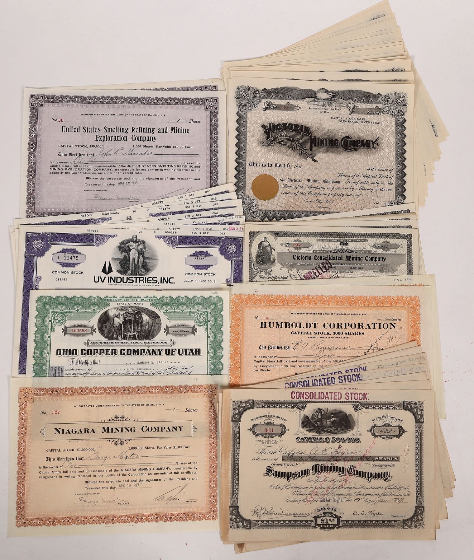 Lot of 45. Includes: Niagara Mining Co. (1937); Ohio Copper Co. of Utah (1950); Sampson Mining Co. (7 stocks, 1897-1910, Bingham); Humboldt Corporation (1919 & 1920); Victoria Consolidated Mining Co. (4 stocks, 3 issued 1910); UV Industries, Inc. (8 stocks, 1979); United States Smelting Refining & Mining Exploration Co. (1912 & 1938); and Victoria Mining Co. (20 unissued stocks). Please inspect.