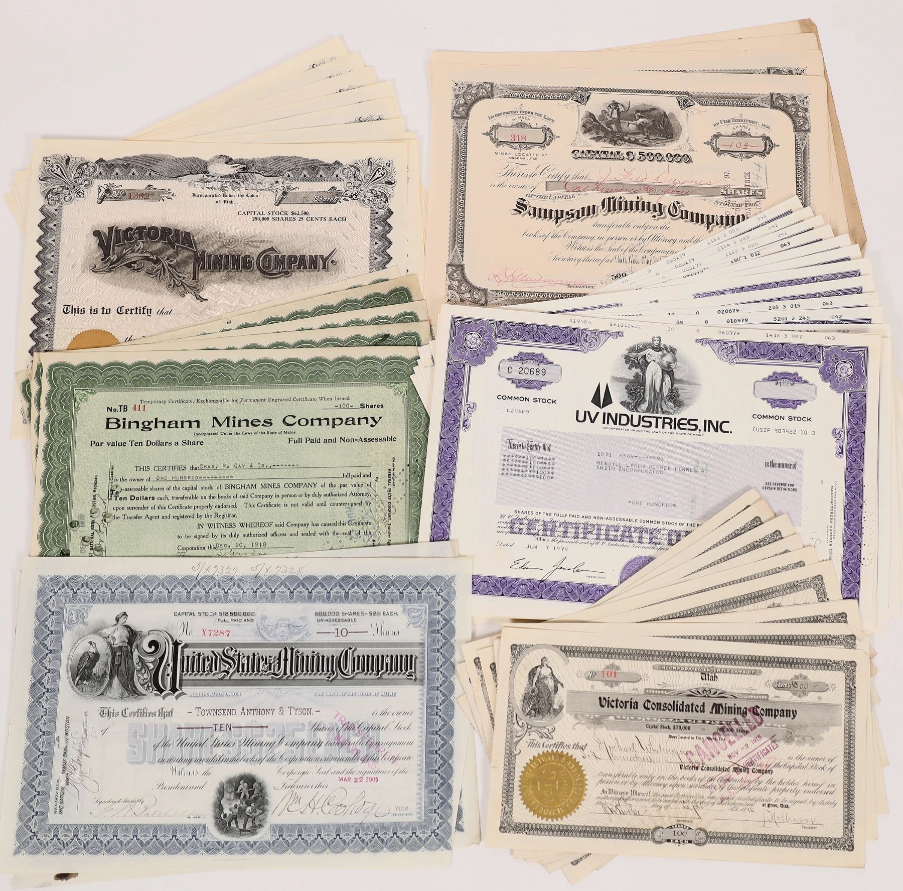 Lot of 47. Included: Victoria Consolidated Mining Co. (10 stocks, 1910, Tintic); United States Mining Co. (2 stocks, 1905); Bingham Mines Co. (5 stocks, 1918-22); Sampson Mining Company (5 stocks, 1896-97, Bingham); UV Industries Inc. (15 stocks, 1979); and Victoria Mining Co. (10 unissued stocks). Please inspect.
