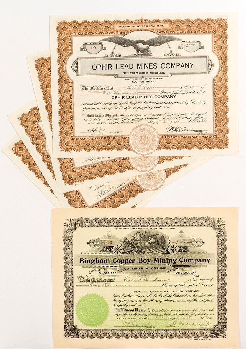 6 certificates. Two Bingham Copper Boy Mining Company, issued 1910 with vignette of 3 miners. Mine located in Bingham Canyon, 8.5" x 11". Four Ophir Lead Mines Company with eagle vignette, issued 1930-1931. 8.5" x 11". Date: 1910 Location: Bingham Canyon, Salt Lake County, Utah HWAC# 51727