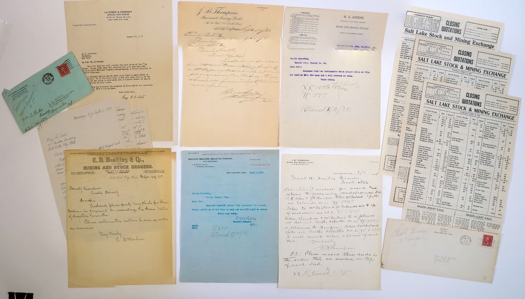 9 pieces of Utah mining related stock ephemeras. La Coste & Co, J B Thompson, several Salt Lake Stock and Mining Exchange closing quotations, E D Haskins, American Smelters, H S Joseph. c. 1899-1927. Utah Geff Pollock Collection