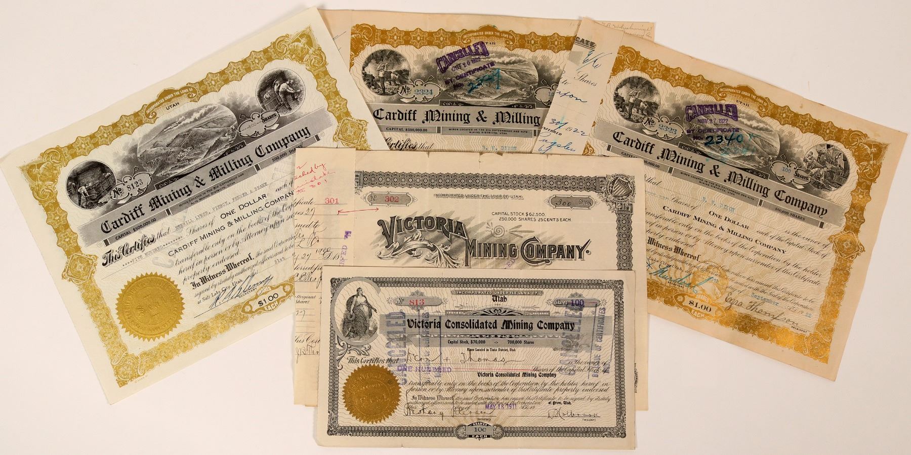 Lot of 5. 1) Victoria Consolidated Mining Company (1911). Cancelled. 2) Victoria Mining Company (1900). 3) Cardiff Mining & Milling Company (1953). 4) Cardiff Mining & Milling Company (1922). 5) Cardiff Mining & Milling Company (1922). Utah