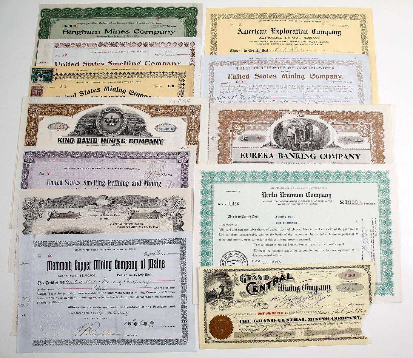 Approximately 14 mining stock certificates from Utah mining operations including Bingham Mines Company, King David Mining Co., Victoria Mining Co., and more. Date: 1899-1955 Location: Utah HWAC# 64037