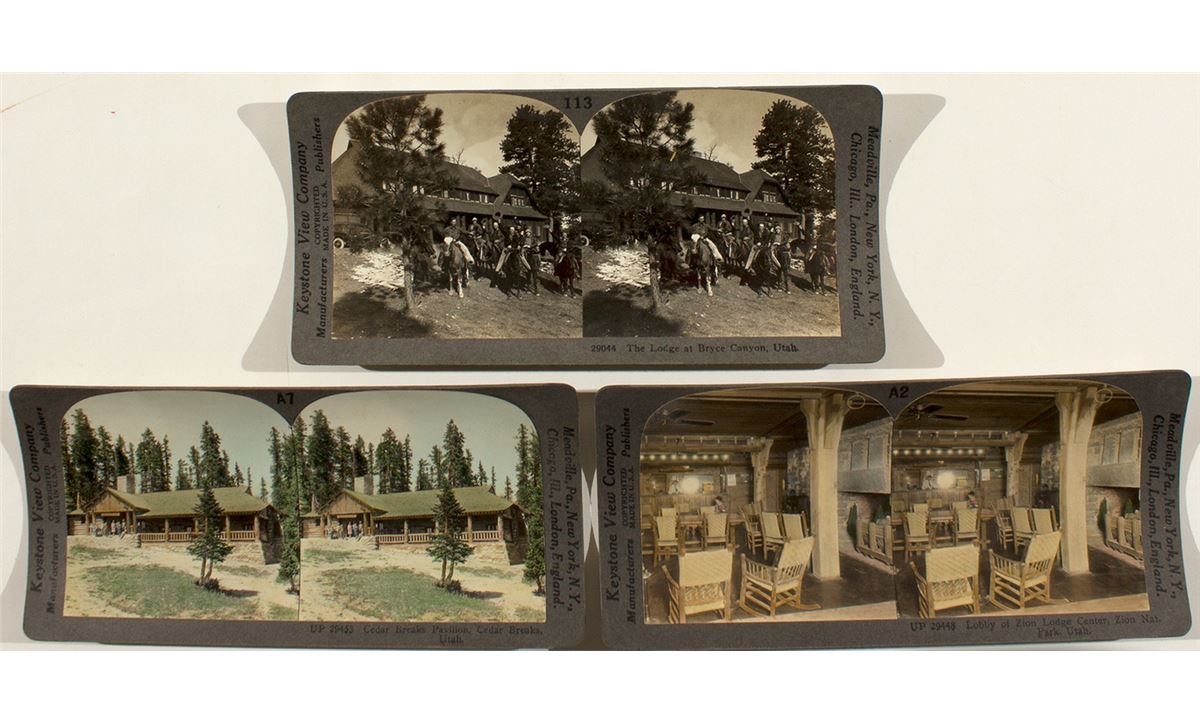 Three different, two in color. All published by Keystone View Company. Includes: UP 29448 "Lobby of Zion Lodge Center, Zion Nat. Park, Utah"; UP 29453 "Cedar Breaks Pavilion, Cedar Breaks, Utah"; and 29044. "The Lodge at Bryce Canyon, Utah" (black and white with group on horseback). Bowed. Nice trio! (Prag Collection)
