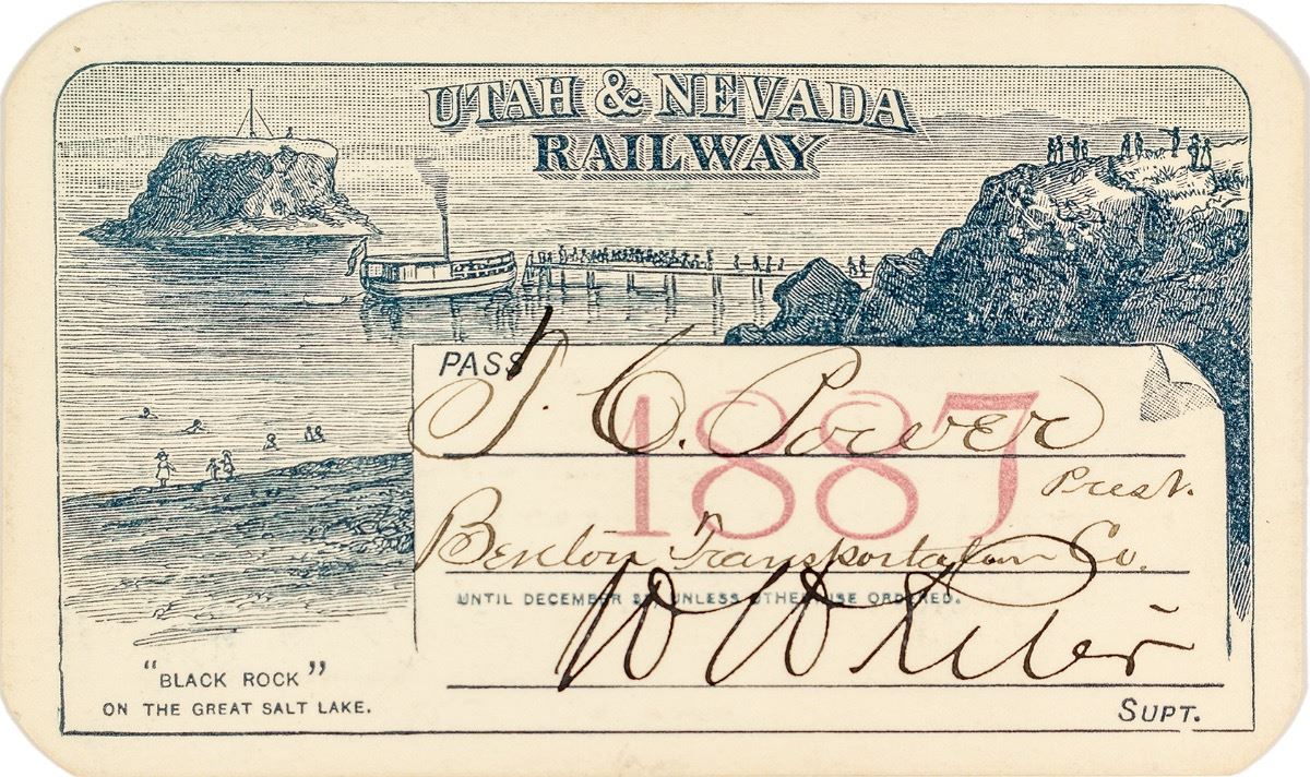Very attractive pass issued 1887. Nice vignette of "Black Rock" at Salt Lake City. What makes this pass even more special is that it was issued to TC Power, an influential Montana mining, real estate, and mercantile mogul who also later served as a US Senator. At this time, he was the president of Benton Transportation Co., a steamer company on the Missouri River (please see our pass in this sale for that company!). Signed by W.W. Riter as superintendent. Not endorsed on reverse. Clean. Despite its name, the railroad never made it to Nevada. In 1889, it was merged with other rails to form the Ogden Short Line & Utah Northern Railway. (Prag Collection) City: Salt Lake City State: Utah, Date: Inventory# 39069