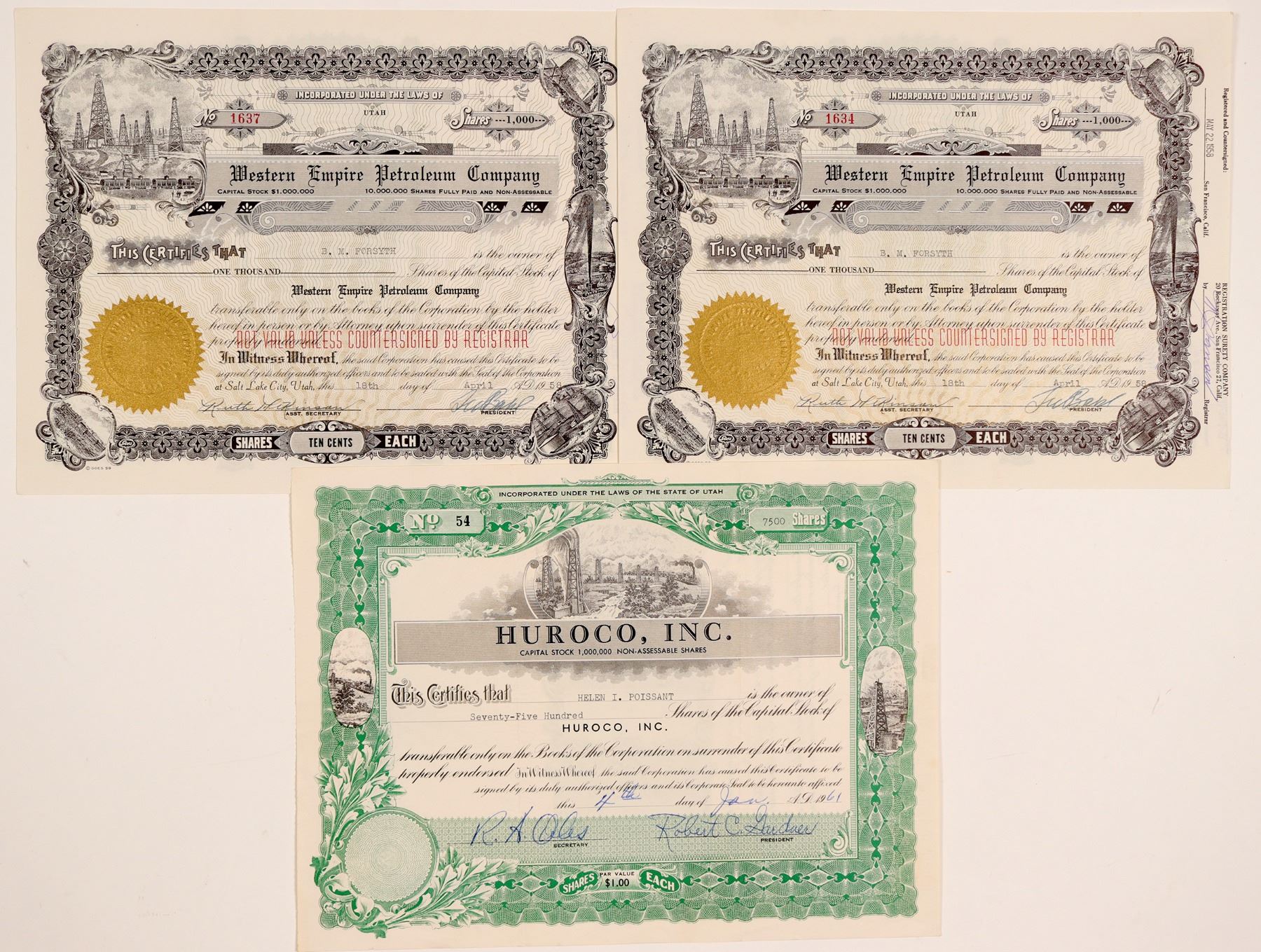 Lot of four. Western Empire Petroleum. # 1637. Oil field vignette. 1958. 2) Western Empire Petroleum. # 1634. Oil field vignette. 1958. 3) Virgin Dome Oil Company. 1924. # 2233. Oil field vignette. 4) Huroco, Inc. 1961. Number 54. Oil field Vignette. Condition ranges from nice to extremely nice. Ken Prag Collection