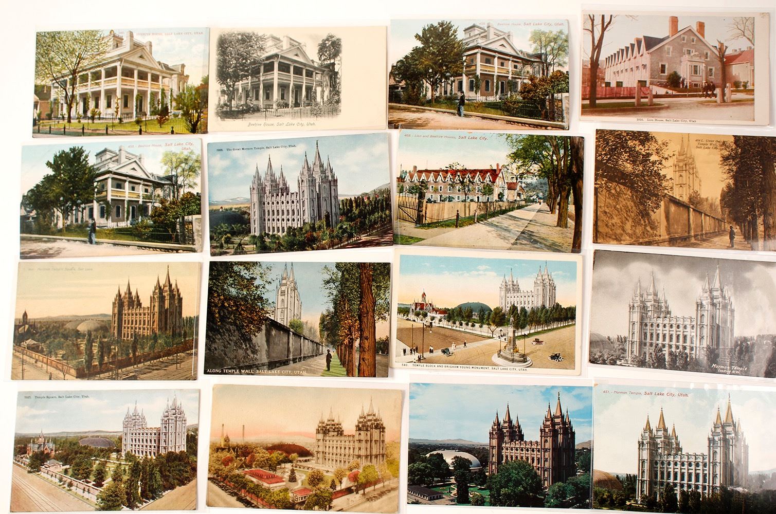 Lot of 63 including 8 real photo. 1) Real photo: inside of Tabernacle showing the great organ; outside Tabernacle; two of Eagle Gate; and four exterior of Mormon Temple (Temple Block, Square). All unmailed. 2) Fourteen Tabernacle specific printed cards, including interior views, most early, postmarks 1906-1936, 7 unmailed. 3) Thirty-eight other cards, most of the Temple, also of Beehive House. Postmarks 1901-1961. Most are early, some modern. 21 not mailed. Please inspect. (Prag Collection) Date: 1901-1961 Location: Salt Lake City, Utah HWAC# 55434