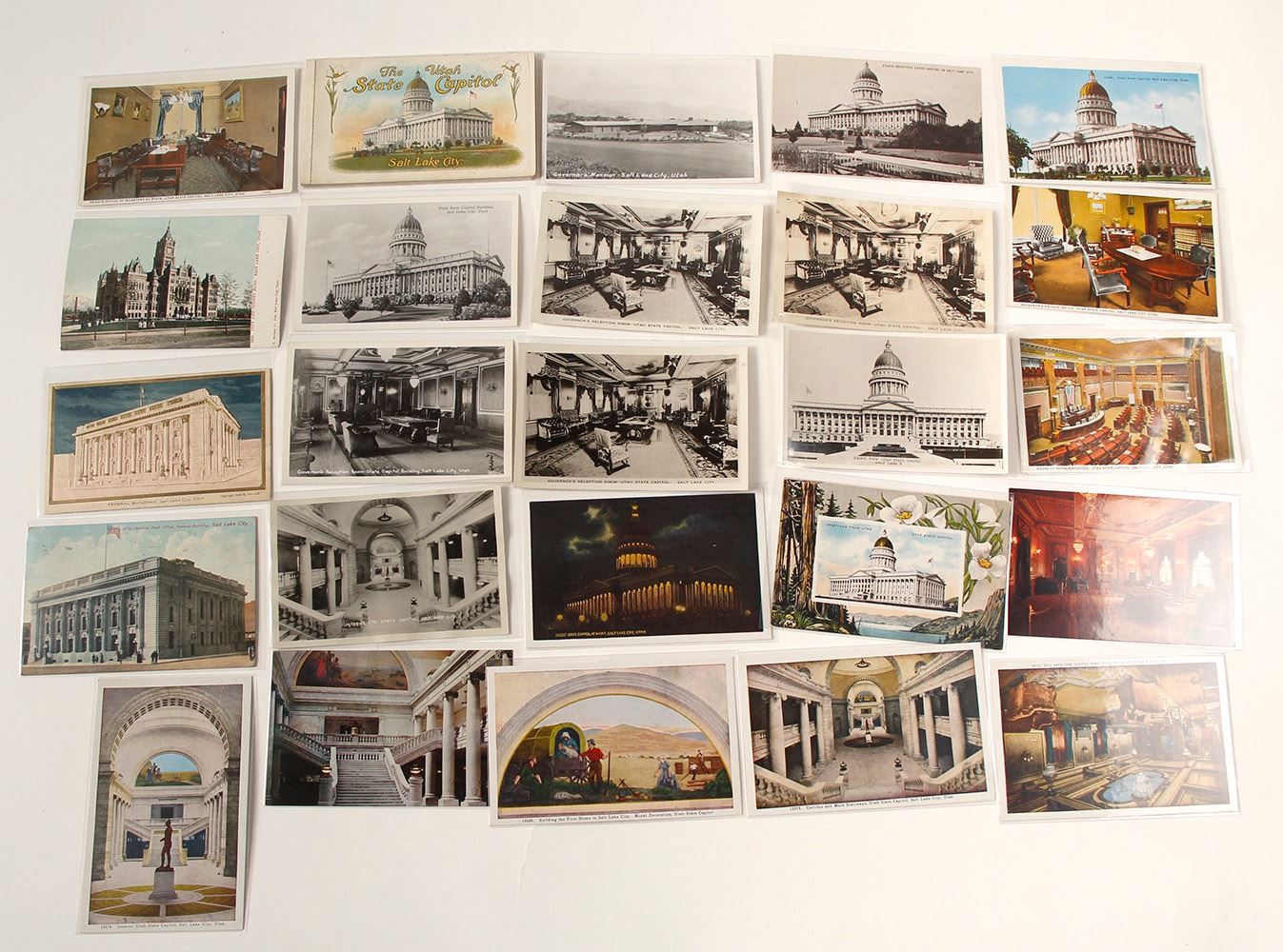 Lot of 36 incl. 9 RPC. Twenty-four single postcards plus one booklet of 12. 1) Nine real photo postcards: 3 exterior of state capitol building; four interior showing the governor's reception room; one exterior of governor's mansion; and one interior of state capitol building. 2) The Utah State Capitol. 12 postcard booklet. Early printed color cards by Evans, Salt Lake City. 3) Rest of group: city & county building in SLC; private office of secretary of state; post office, federal building exterior; governor's reception room; interior capitol building; governor's private office; house of representatives; raised 1906 card of the federal building (damaged); and exteriors of capitol building. Two mailed, 1908 & 1915. (Prag Collection) Date: Location: Salt Lake City, Utah HWAC# 55440