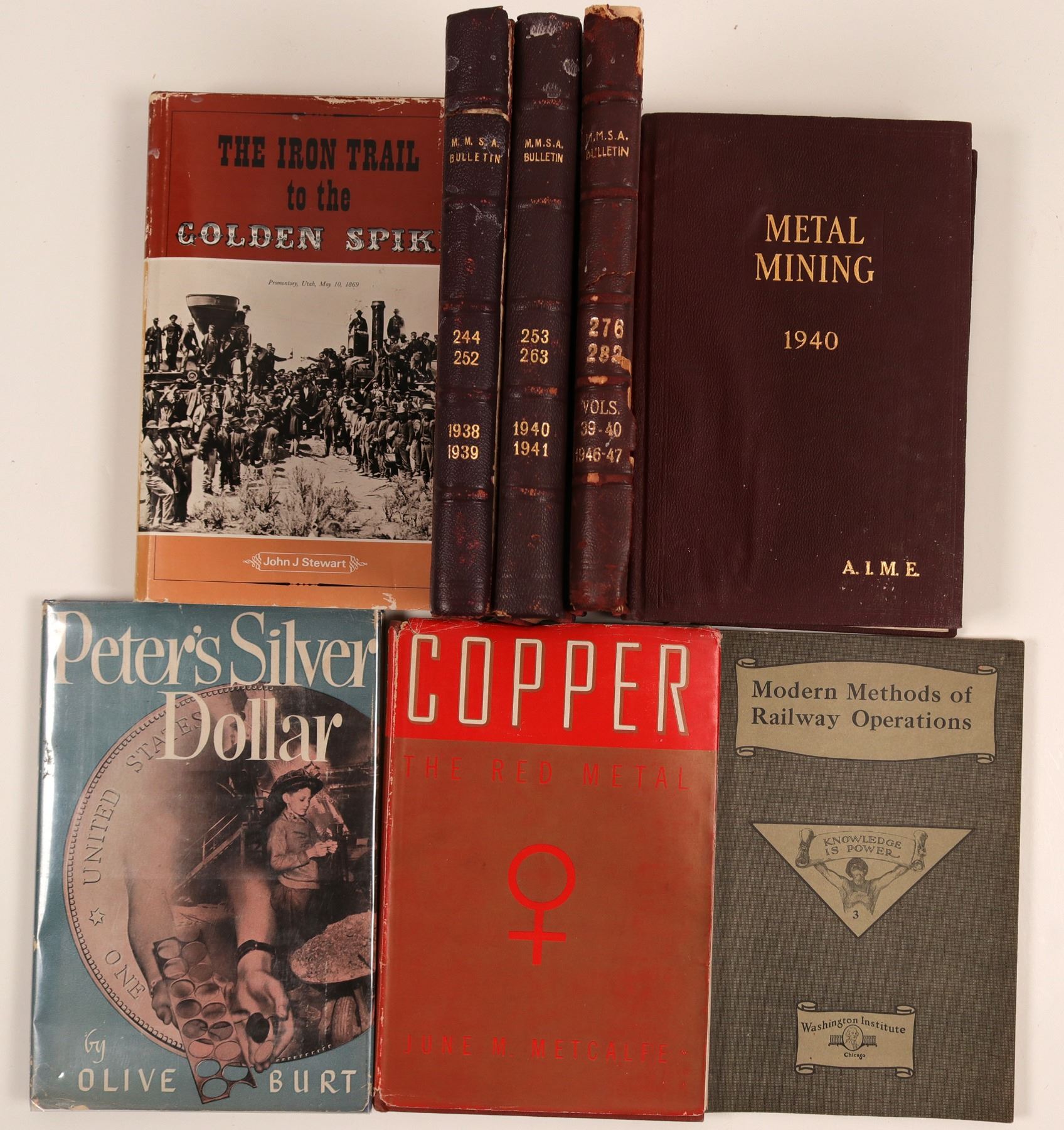 Hardcover 1939 New Intl Atlas of the World, Copper The Red Metal by Metcalfe, MMSA Bulletin, 1938-39, 1940-41, 1946-47, Modern Methods of Railway Operations, The Iron Trail to the Golden Spike by Stewart, Utah Ghost Rails by Carr, Peters Silver Dollar by Burt, AIME 1940 Metal Mining