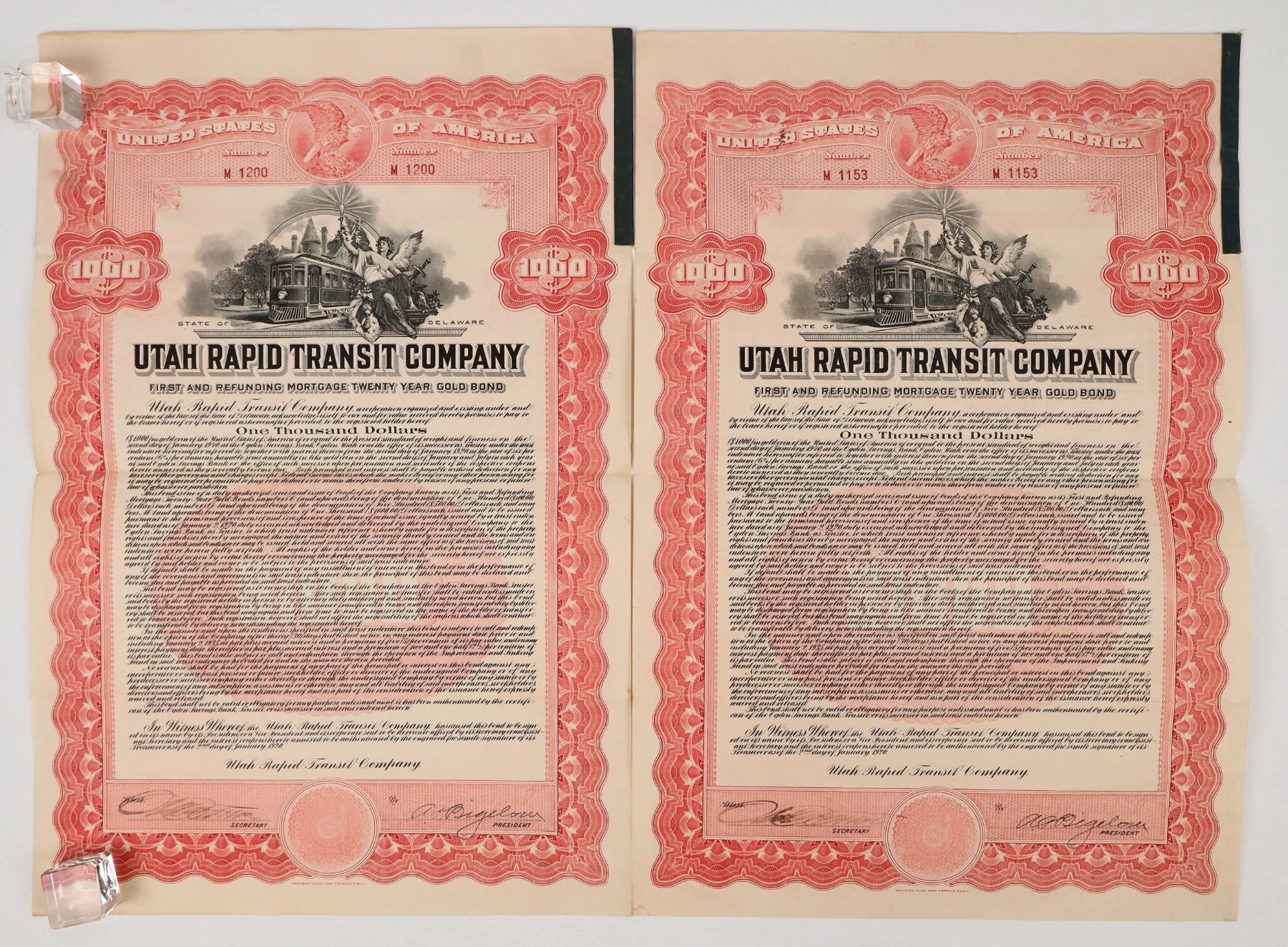 Lot of (2). Issued by the Utah Rapid Transit Company, First and Refunding Mortgage Twenty Year Gold Bond certificates, $1000 Bond. Bound attached complete sheets of $30 Coupons, total of (40). Half-fold certificate, measures 15.25"x10.25" extended, with great vignette at top center. Overall condition is very good, some minor fold and age issues evident, please see photos.