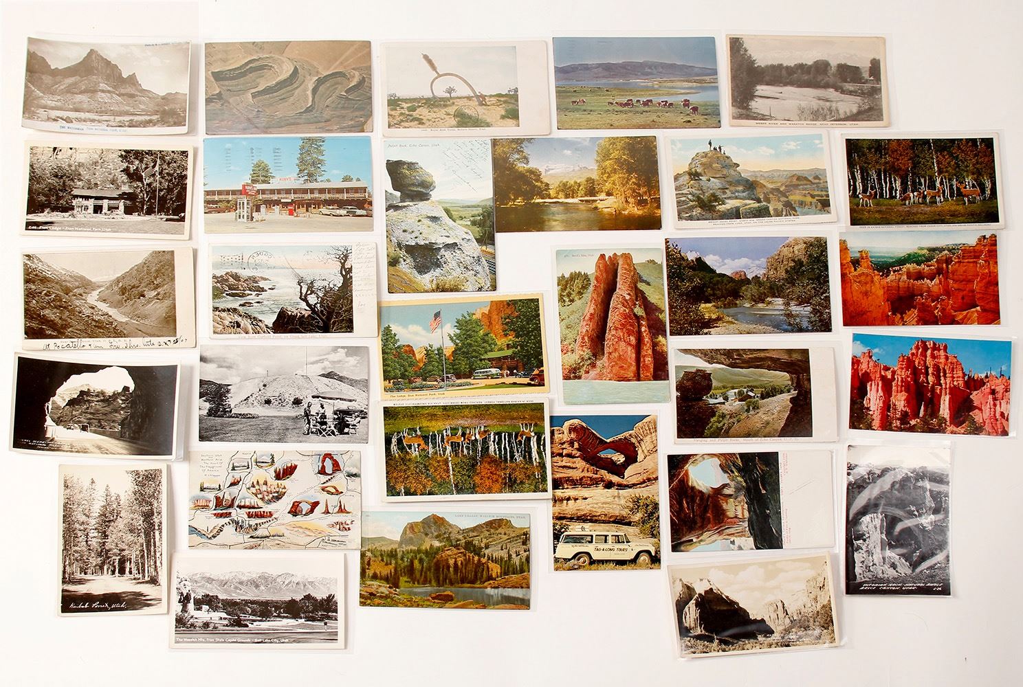 Lot of 30 including 8 real photo. Real photo include: Wasatch Mtns. from Salt Lake City; Angels Landing, Zion National Park; Victorian Arch, Bryce Canyon; Kaibab Forest; Tunnel in Zion; Bear River Canyon; Zion Lodge; and The Watchman in Zion. None mailed. Other cards are mix of early printed and later: Lake Lillian, "Vulcan's Tomb", Bryce Canyon views, deer in Kaibab Forest, Echo Canyon, Devil's Slide, Heber Valley crater, Weber River, Royal Arch Yucca, Pulpit Rock, and Garfield Point. Eight mailed, 1903-1971. (Prag Collection) Date: 1903-1971 Location: Utah HWAC# 55439